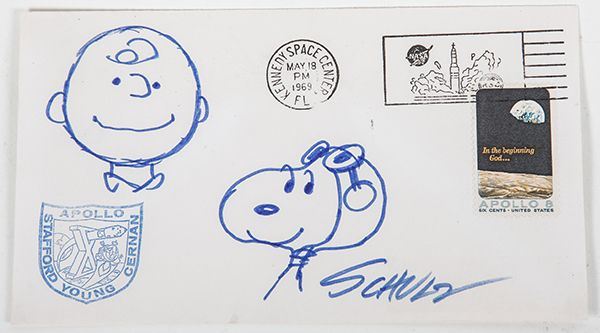 Apollo 10 Launch Day Cover With Hand Drawn Pictures of Charlie Brown and Snoopy Drawn By Charles Schultz. This Apollo 10 launch day cover has an official NASA-KSC cachet and is postmarked "Kennedy Space Center, FL May 18 1969". An Apollo 8 six cent stamp is affixed. Charles Schultz not only signed the cover but drew the pictures of Charlie Brown and Snoopy. Both of these characters became semi-official mascots for the mission because their names were used as the call signs for the Command Module and Lunar Module. The consignor was president of the KSC Philatelic Society. A very striking cover.