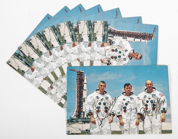 Attractive picture postcard of the crew in their space suits standing in front of the Saturn V. Gene Cernan, John Young and Tom Stafford each autographed across their chest in clean, bold black ink. An additional 7 unsigned postcard with the same image are also included. Attractive.