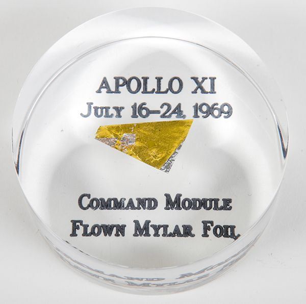 Apollo 11, 1969, Flown Gold Foil (.5x.5") mounted in a clear Lucite cylinder (3x1") that is engraved on the bottom: "Apollo XI / July 16-24 / 1969, Command Module / Flown Mylar Foil". Pristine condition.