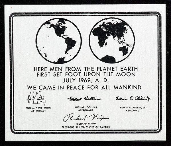 Apollo 11 Lunar Plaque � Made From the Original Negative. The original Apollo 11 stainless steel plaque measures 9" x 7 5/8" and is affixed to the Eagle�s ladder. This aluminum plaque measuring 3"x 2�" was made by NASA from the same negative using the same photo etching process as the one on the LM. Includes a consignor�s handwritten, signed COA that reads in part, "This small Apollo 11 plaque was made from the master negative. This same negative was used to produce the plaque left on the lunar surface." No more than 200 of these small plaques were made and given to NASA employees and most have likely been lost over the years. This would go nicely with the 2 squares of Kapton foil also offered in this section.