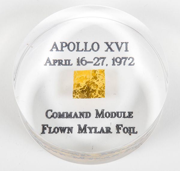 Apollo 16, 1972, Flown Gold Foil (.5x.5") mounted in a clear Lucite cylinder (3x1") that is engraved on the bottom: "Apollo XVI / April 16-27 / 1972, Command Module / Flown Mylar Foil". Pristine condition.