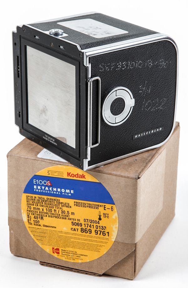 Apollo Program, 70mm. Hasselblad Black Leather Film Magazine (3.5x3.5x3.5") with white stenciled ID No. SEF33101018-301, S/N 1022. Includes magazine slide. There is a small blue velcro patch on the film slide and various tape stains on the magazine. Similar magazines were is use by photographers throughout the Apollo Program era. A new unopened/boxed roll of 70mm film is included with this lot. Clean and scarce.