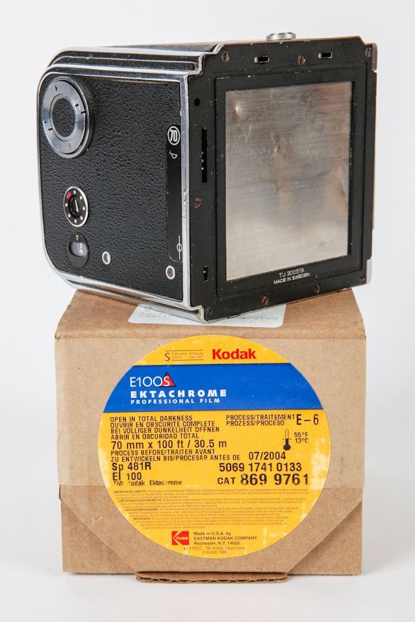 Apollo Program, 70mm. Hasselblad Black Leather Film Magazine (3.5x3.5x3.5") with white stenciled ID No. SEB 33100082-201 / S/N X5 anf magazine slide. There is a small blue velcro patch on the film slide and various tape stains on the magazine. Similar magazines were is use by photographers throughout the Apollo Program era. A new unopened/boxed roll of 70mm film is included with this lot. Clean and scarce.