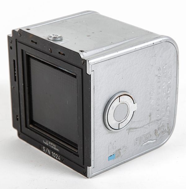 Apollo Program, Hasselblad 70mm. Silver Film Magazine (3.25.x3.5x3.25") ID No. P/N SEF 33101018-301, S/N 1024. This film magazine has a magazine slide and two white velcro tape patrches on one end. Used, but good overall condition. This is the type of Hasselbad magazine used by the astronauts on the lunar surface as the silver color reflected heat better than the original dark leather magazine cover. An important find.