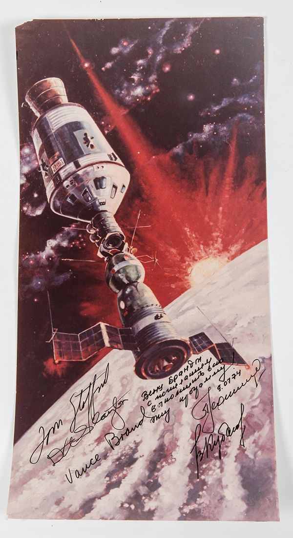 Apollo / Soyuz - 5 Crew Autographs. This is a photographic reproduction of art work painted by Alexi Leonov one of the crew members and an accomplished artist. It is signed by Stafford, Brand, Slayton, Leonov and Kubasov and measures 7 x 14". (Some tape residue is evident on the back and also a slight tear in the upper left corner.).