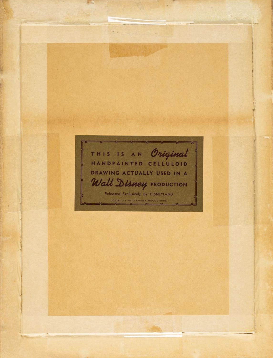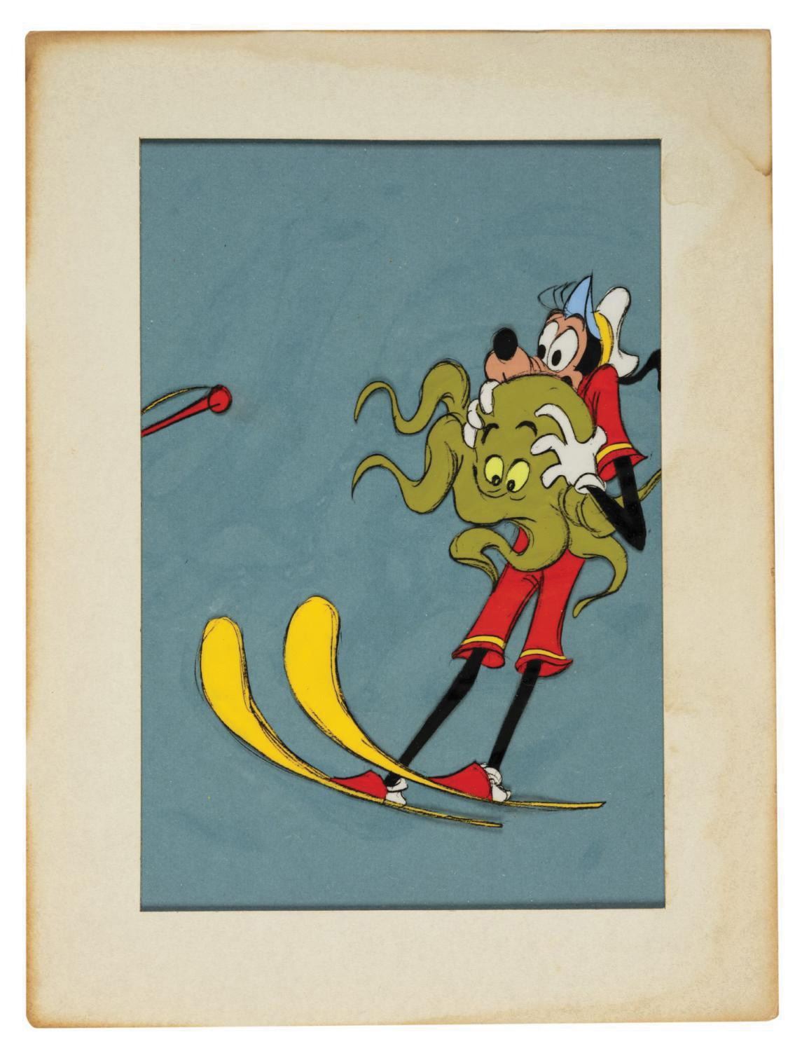 (Disney, 1961) A particularly dynamic animation cel from one of Goofy's final Golden Era shorts, "Aquamania." In the film Goofy inadvertently enters into a water ski race and becomes entangled with a frightened octopus. The cel was trimmed and prepared in a mat frame for sale at the Disneyland Art Corner. The piece has a 9.25"x6.25" mat opening within its 12"x9" mat, and the painted character image size is 7.25"x5.5". Although the edges of the mat exhibit some discoloration due to age, the cel itself is in very fine condition and retains a Disneyland label on the reverse.