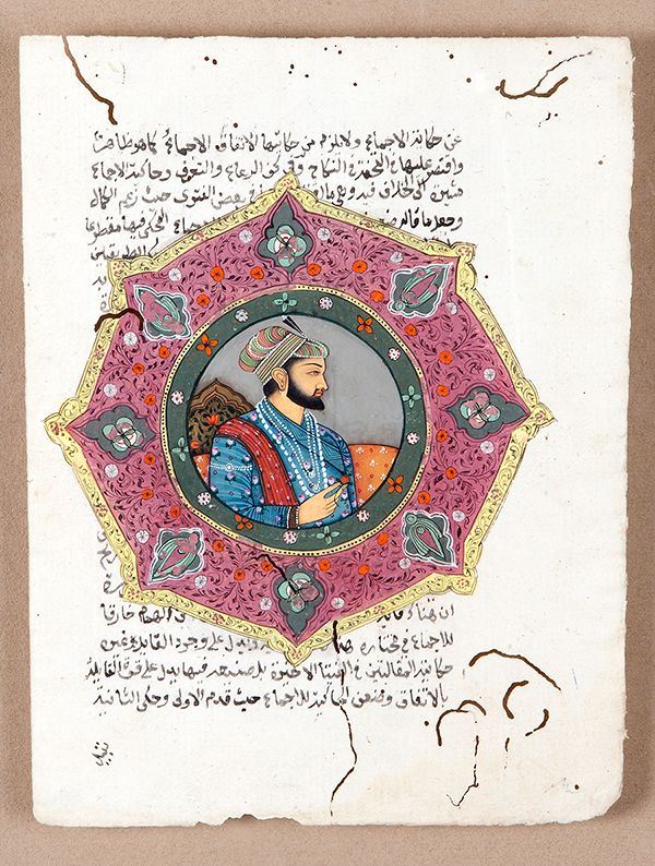 [arabic Script] Manuscript Page. Handwritten page, recto and verso, 6� x 8� in. 19th century (?). The front features a lovely, handcolored portrait of a richly-attired man; the verso has text only. It concerns the deeds of a king.