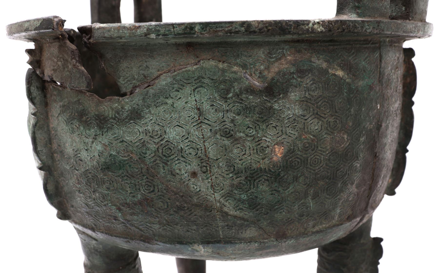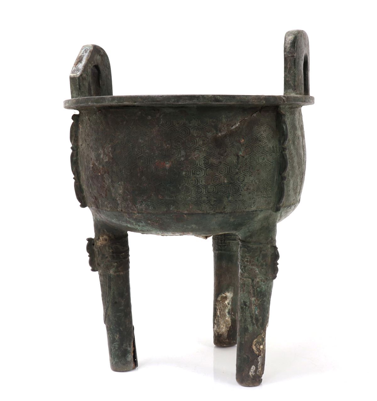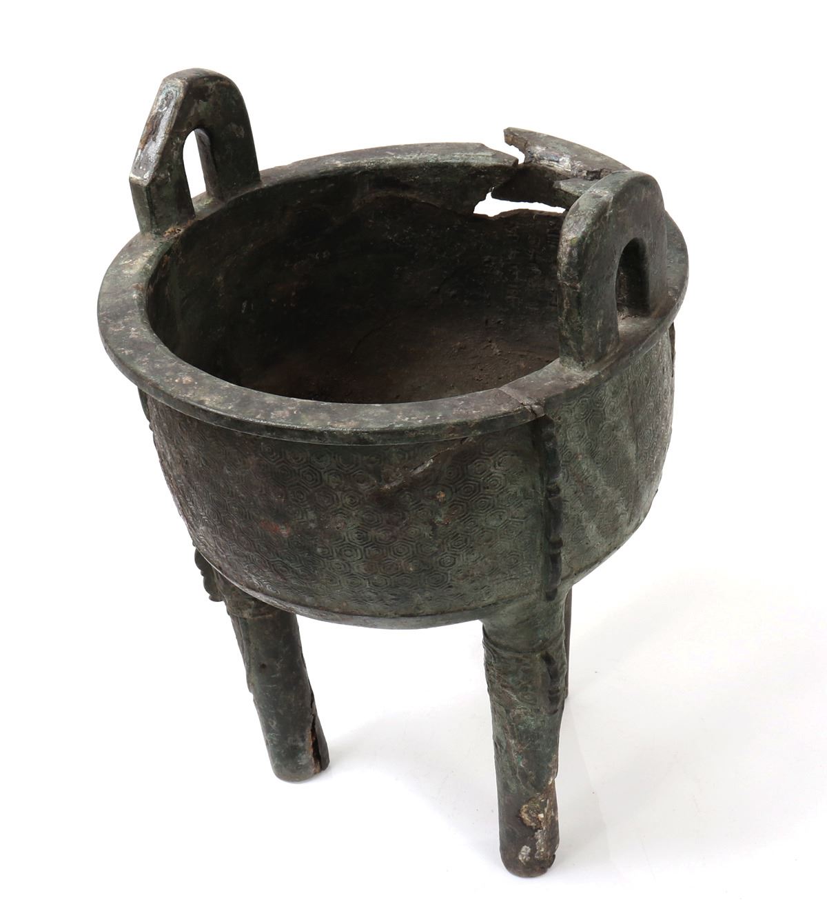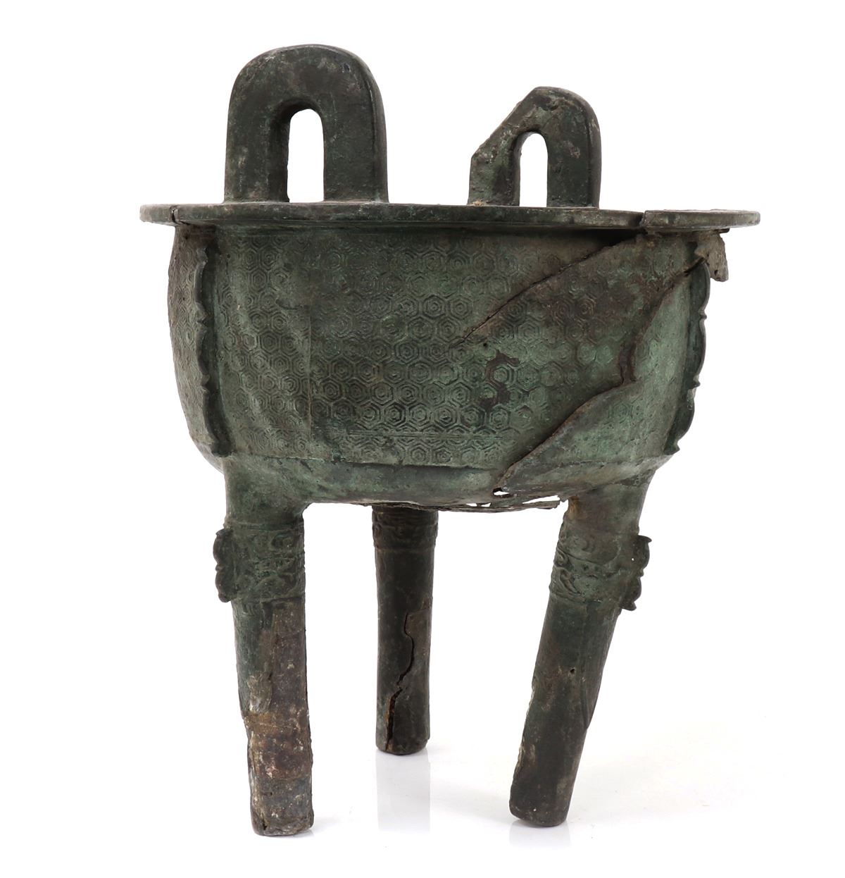 Chinese bronze ritual food vessel or ding style vessel in the archaistic style of the Zhou dynasty possibly 12th century or earlier. Three round long legs each with old repairs and embossed decoration or writing. The body with old repairs and damage decorated to the surface with geometric patterns of hexagonal contained within additional hexagon. Size 9" L x 10" W x 13" H, weight 5505g. Provenance: Ex-Pasadena Estate