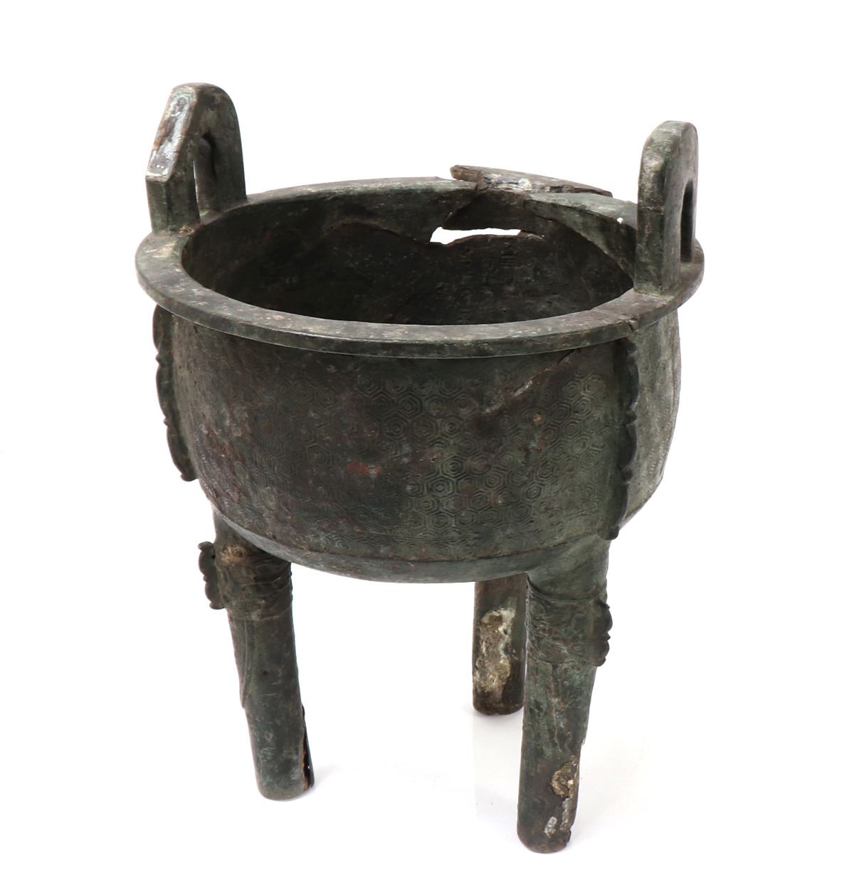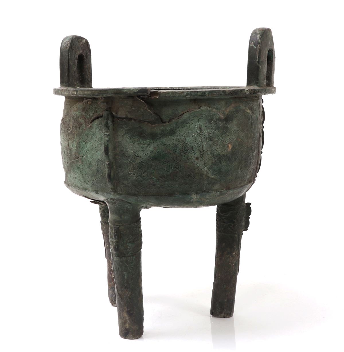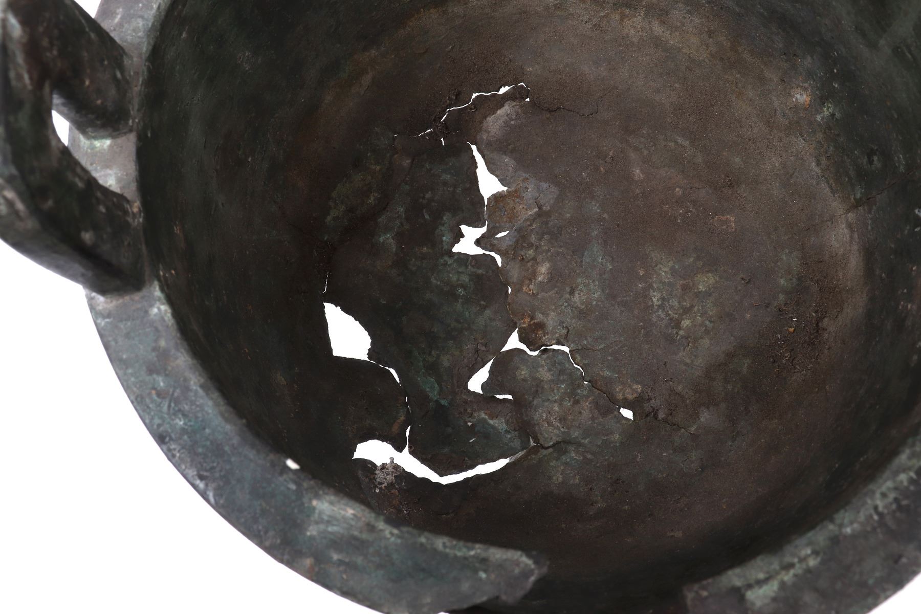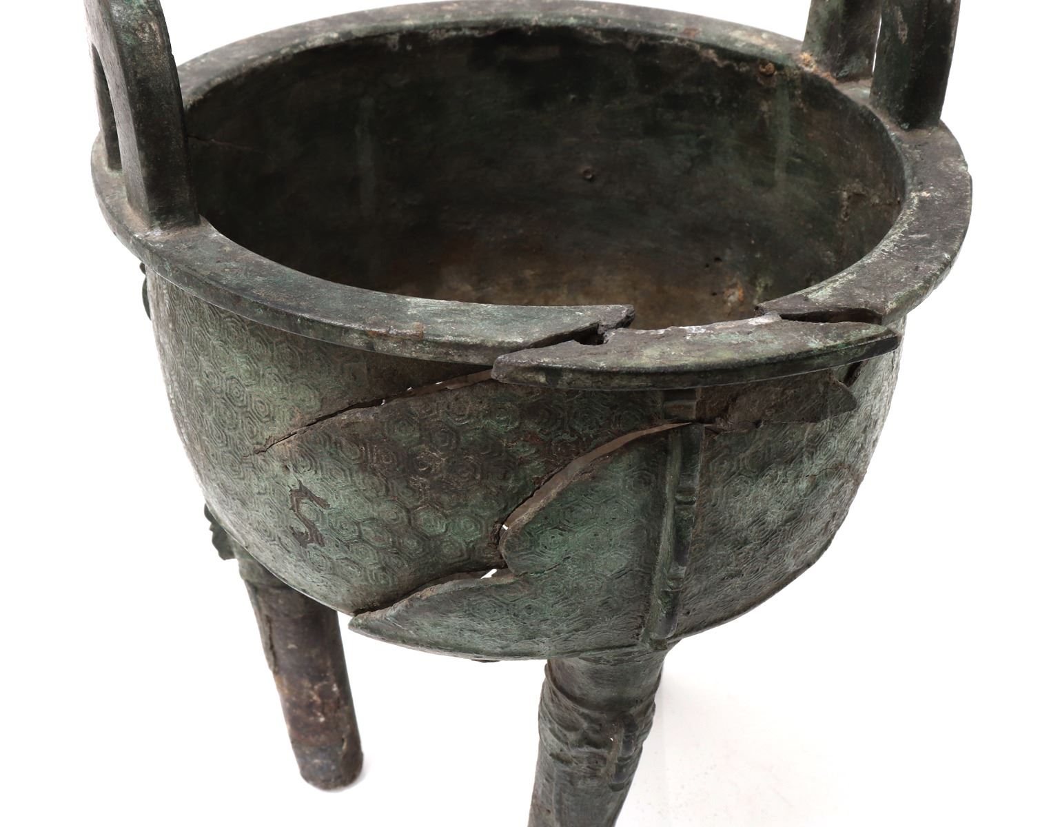 Chinese bronze ritual food vessel or ding style vessel in the archaistic style of the Zhou dynasty possibly 12th century or earlier. Three round long legs each with old repairs and embossed decoration or writing. The body with old repairs and damage decorated to the surface with geometric patterns of hexagonal contained within additional hexagon. Size 9" L x 10" W x 13" H, weight 5505g. Provenance: Ex-Pasadena Estate