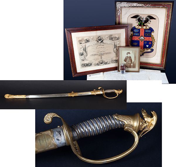 Archive of Col. M.T. Donohoe With Tiffany Presentation Sword. This Tiffany sword belonged to Union Brevet Brigadier General Michael T. Donohoe. Born in Lowell, Massachusetts, Donohoe (1838- 1895) was commissioned Captain to "C" Co. New Hampshire 3rd Infantry in August 1861, and was promoted to Colonel of the 10th New Hampshire Volunteer Regiment ("Irish Regiment") in August 1862. He was severely wounded at Ft. Harrison, Virginia on September 29, 1864 and was brevetted Brigadier General, Volunteers, March 13, 1865 "for gallant service in the field." Along with the sword, in its original wooden case, this archive contains Donohoe's silver and leather flask, six Civil War date letters and documents, a photograph of Donohoe in uniform, his certificate of membership in the Society of the Army of the Potomac, signed by U.S. Grant, and a printed shield with Donohoe's service record.