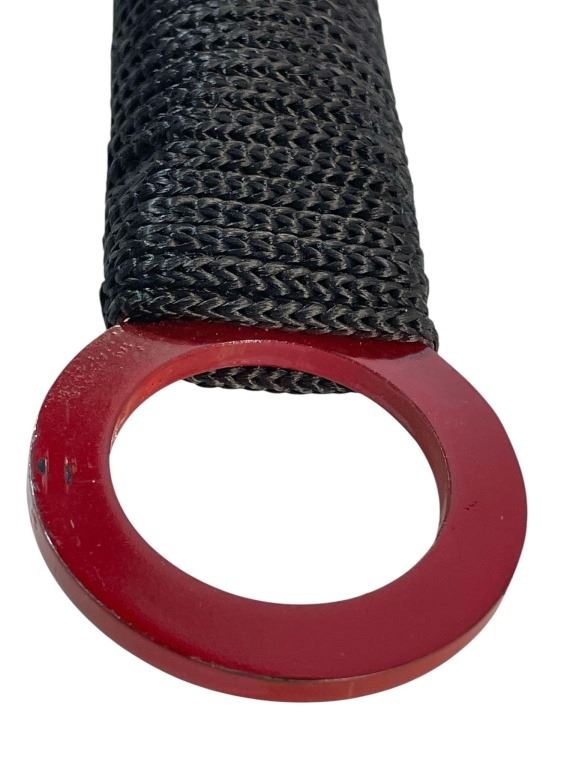 Made of metal with black paracord wrapped handle. Circle on end is resin.
