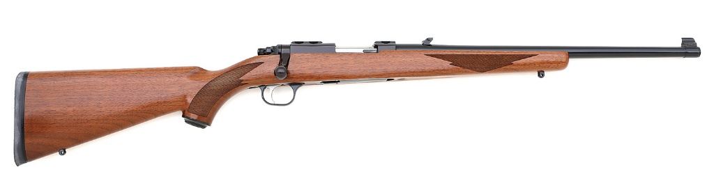 serial #740-00142, 44 Magnum, 18 1/2" barrel with a bright excellent bore. This lovely carbine comes from the personal collection of Stephen Sanetti, former President and COO of Sturm, Ruger & Co., and includes a certificate of authenticity verifying that it was acquired by Mr. Sanetti during his tenure as a member of Ruger's now-defunct ''low serial number'' program, featuring his number ''142''. It appears as-new-in-box, with the receiver and bolt handle toning lightly to plum and the only apology being some typical light aging discoloration on the buttpad. It retains the factory open sights and integral ring mounts and the checkered walnut stock shows handsome straight-grain figuring and rates excellent. Included with this rifle is the factory box, correctly end-labeled to the gun, manual, paperwork, new-in-box Ruger rings, a single factory 4-round magazine, and factory invoice indicating that this rifle left the factory in September of 1997. A lovely first-year 77/44 which have been enjoying increased interest from both collectors and shooters. (26A11655-13) {MODERN} [The Stephen Sanetti Collection] (1200/1800)