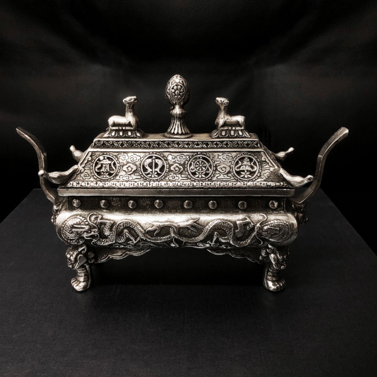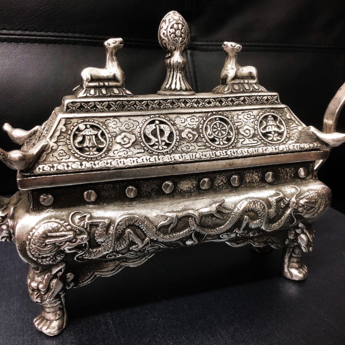An Asian Tibetan Silver Incense Burner Decorated With Dancing Dragons On The Base Of The Burner. Lid Is Decorated With Asian Motif & Figural Animal Finials. View Photos For Further Details.