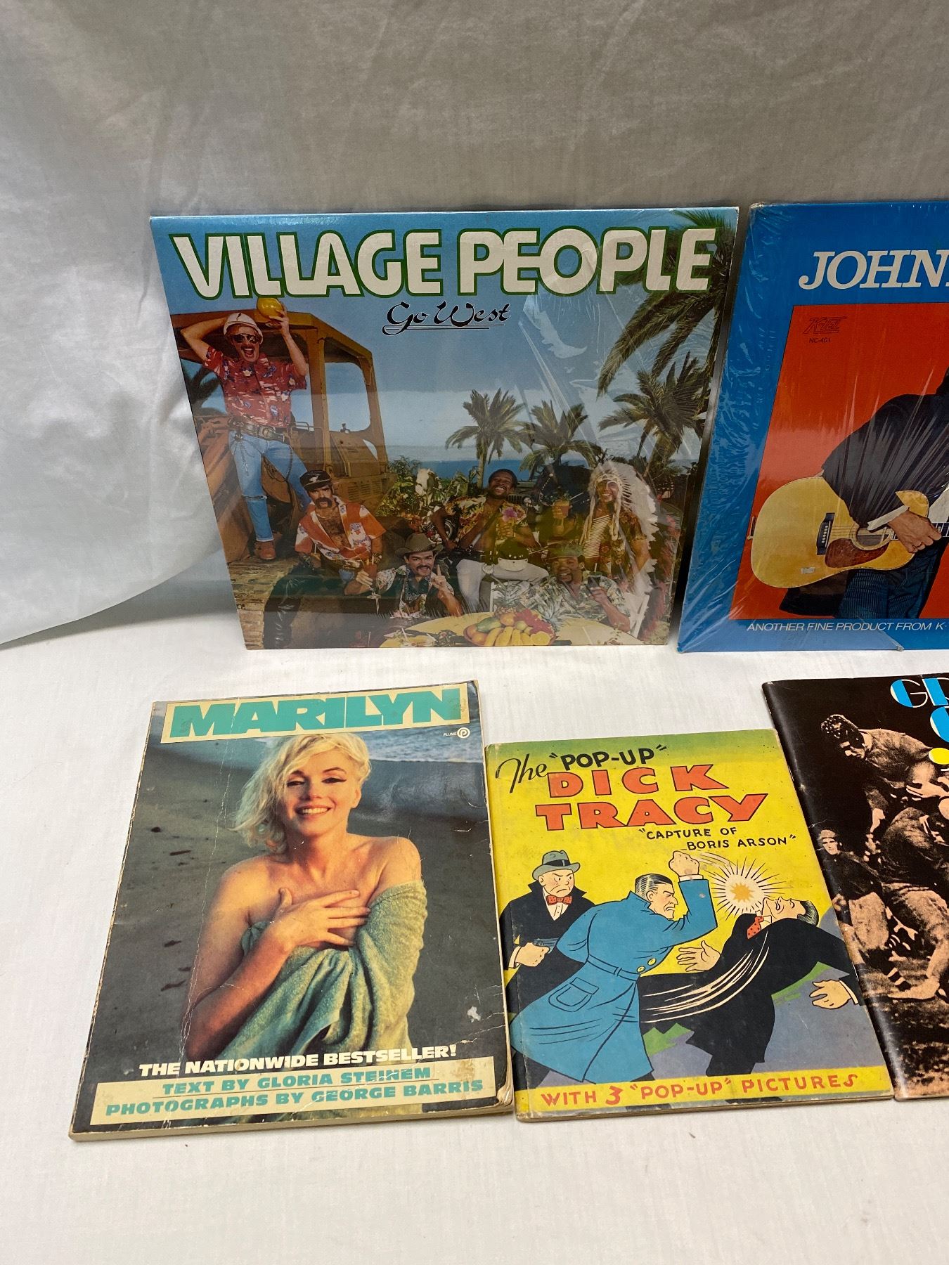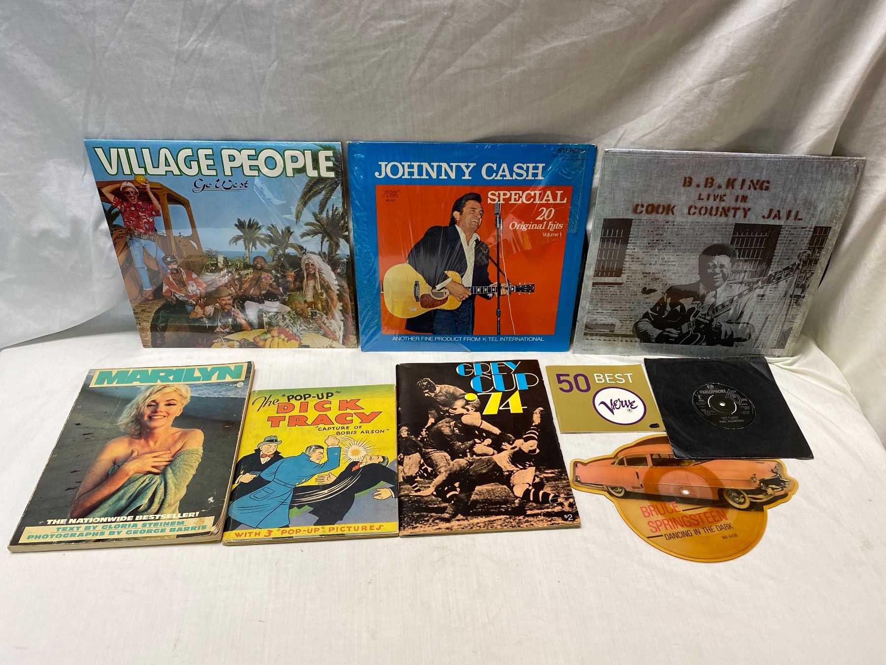 Assorted Records, Books, And Picture Disk, Johnny Cash, Village People, Etc…