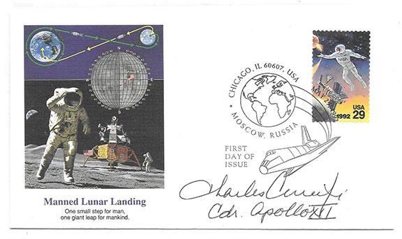 First Day Cover commemorating the Manned Lunar Landing. Choice color cachet of the Maned Lunar Landing, affixed is a U.S. 29 cent NASA astronaut stamp cancelled First Day of Issue, Chicago, Moscow Russia, May 29, 1992. Signed; Charles Conrad CDR. Apollo XII