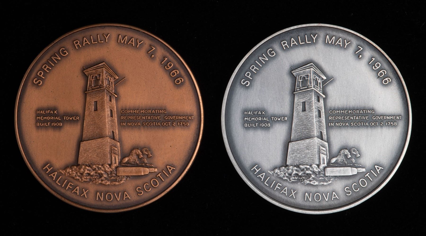 A pair of 40mm medals, issued by the Atlantic Provinces Numismatic Association to the 1966 Spring Rally in Halifax, Nova Scotia. One each in antiqued Bronze and .999 Silver, the latter edge-numbered "33"(with weight of 46.2 grams. (Lot of 2 medals)
