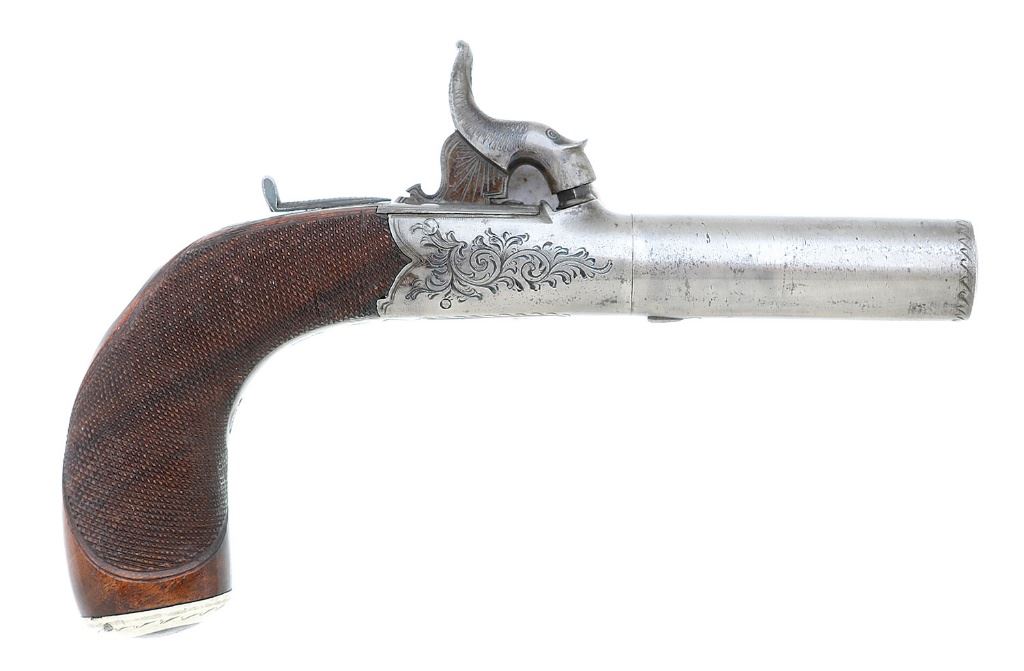 39 bore, 2 1/2'' round barrel with a vey good bore showing some light pitting. The barrel and rounded frame of this nice little pistol retain about 75% nice case-hardened colors that have drifted somewhat to a fine smoky gray mixing with silvery case-hardened patina and vibrant wisps in the protected areas. The dolphin hammer shows vibrant colors throughout, the folding trigger retains flashes of brilliant fire blue and the action shows lovely crisp foliate scrollwork and makers name along the left side. The pistol shows period Birmingham proofs and the finely checkered walnut grip remains in very fine condition showing a couple of minor drying cracks forming and some lightly chipped points. There is an un-engraved German silver monogram plate atop the grip and a nice German silver grip cap with lidded compartment. The lock is crisp and features a sliding half cock safety. This pistol appears to have seen very little actual use and remains in very fine condition, well above average for these popular concealed carry guns. (13A11777-12) {ANTIQUE} (700/900)