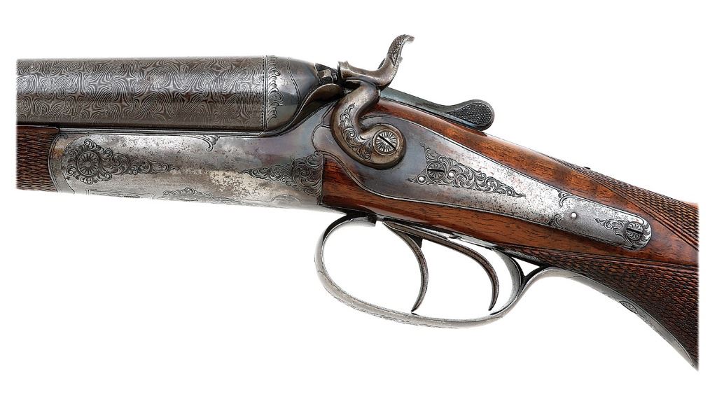 serial #21089, 12 ga (2 1/2''), 29 3/4'' damascus barrels choked modified and full with mostly bright very good bores showing some scattered areas of light pitting. The handsome shotgun was made somewhere between 1890-1897, likely around 1892, and the barrels retain generous plum-brown finish throughout with areas toning to pewter gunmetal patina mostly along the sides nearer the breeches also showing some scattered light handling marks and small spots of old oxidation. The barrels show lovely swirling damascus patterns throughout and the solid matted rib is maker-marked by Husqvarna. The action and back action lockplates retain about 50-60% lovely vibrant case-hardened colors with the balance toning to a pleasant silvery and smoky patina. The triggerguard has mostly toned to silvery case-hardened patina and the top lever retains about 80% original bright blue. The action and lockplates are tastefully embellished with fine quality detailed foliate scrollwork throughout. The checkered pistolgrip walnut buttstock and splinter forend remain in very fine to near excellent condition as lightly and carefully cleaned showing a nice oil finish with a few lightly chipped points and minor dings. The sides of the buttstock show some rather nice grain figure and length-of-pull to the black checkered hard rubber buttplate is 14 1/8''. The shotgun is equipped with sling swivels and brass bead front sight and barrel lock-up is by dual under-bites exhibiting a hint of side-to-side play that is relatively minor, the top lever resting about center and the barrels otherwise on-face. The locks with rebounding hammers seem to function well mechanically. This is a very attractive and well above-average example of these quality Swedish doubles. (13B11604-7) {ANTIQUE} (1000/1500)