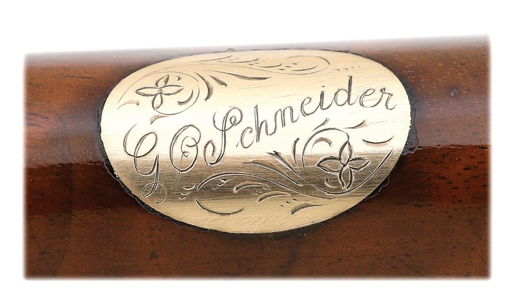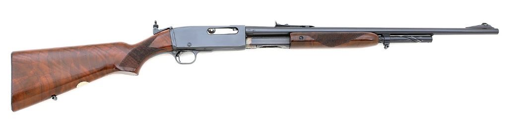 serial #79491, 35 Remington, 24'' barrel with a bright excellent bore. The metal surfaces of this nice September 1950 date-coded rifle retain about 95% original blue showing a little operational wear along the magazine tube, scattered handling marks and most of the loss due to two small spots of pinprick pitting, one on the left side of the barrel shank and the other left-side edge of the action. The rear section of the magazine tube, the loading gate and the trigger all show lovely vibrant case-hardened colors, the bolt remains bright and the extractor shows fine fire blue. The checkered pistolgrip deluxe walnut buttstock and forend remain in excellent condition retaining about 95% original varnish along with some scattered minor dings and light handling marks. The heavy factory varnish is starting to take on a nice craquelure overall and the wood exhibits some attractive grain figure throughout. The original checkered aluminum buttplate is intact and there is a gold monogram plate inlaid along the toe line and neatly engraved with the original owner's name ''G.O. Schneider''. The rifle is fitted with period sling swivel studs and is sighted with a Lyman tang peep sight, standard sporting rear and silver bead on matted ramp front. A fine example of the somewhat scarce 141B in a desirable chambering. (13B11696-4) {C&R} (1200/1800)
