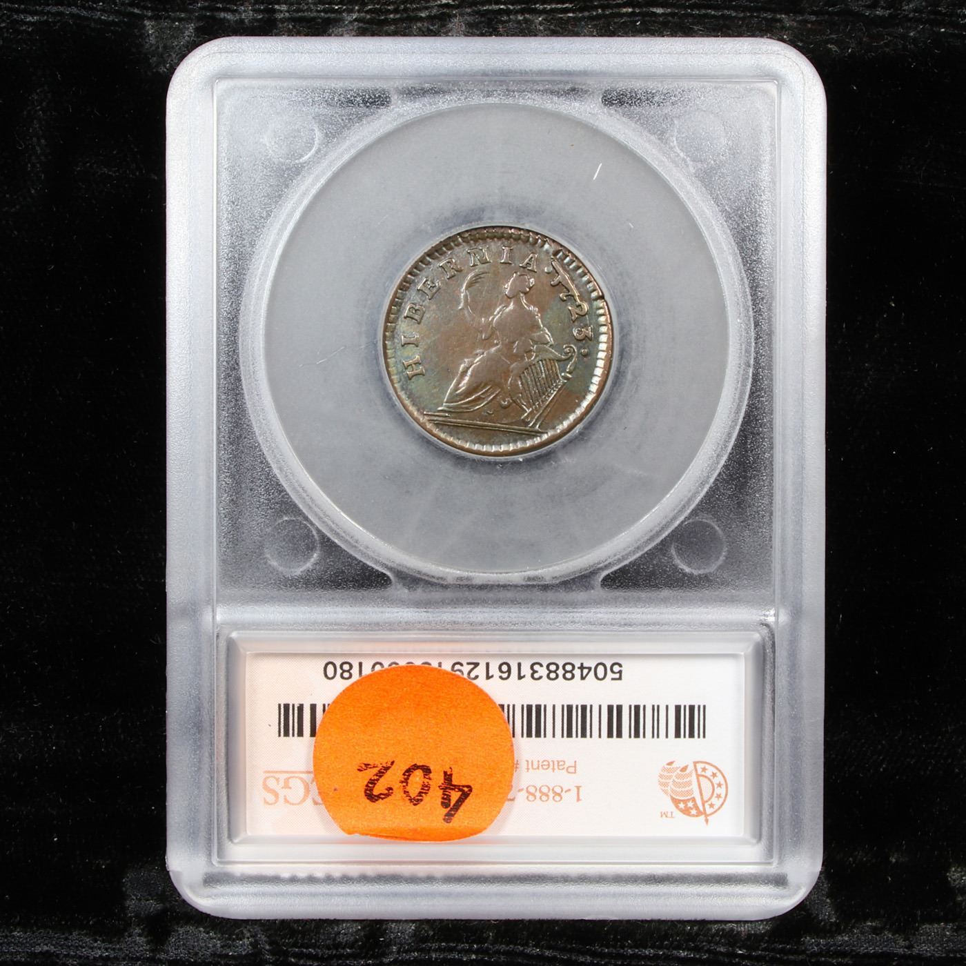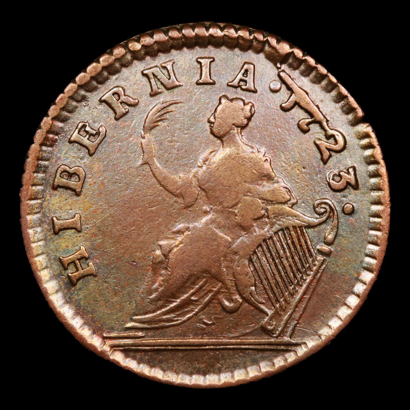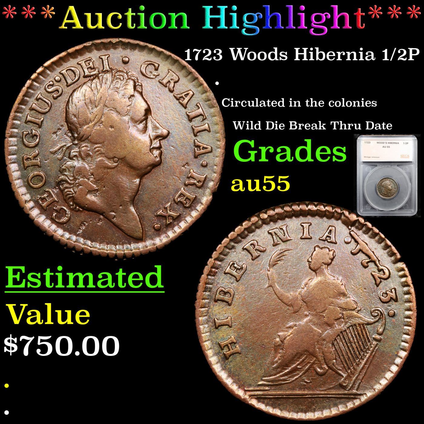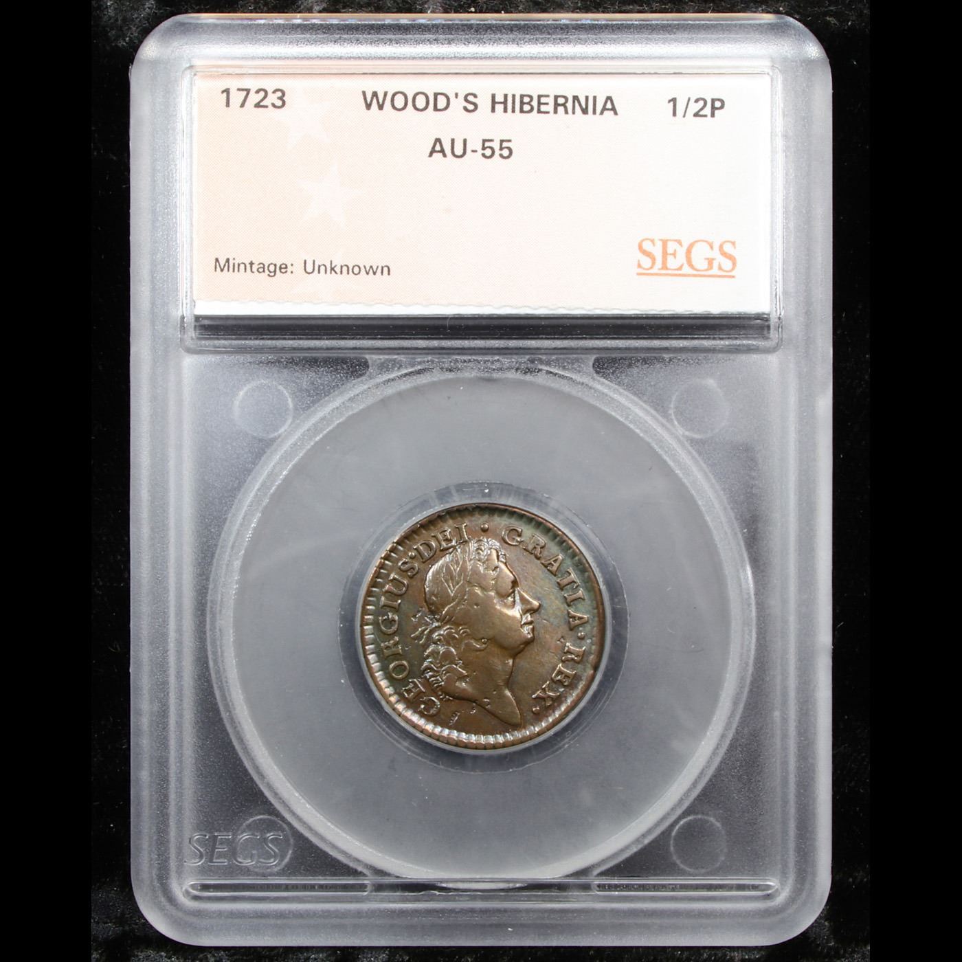 ***Auction Highlight*** 1723 Woods Hibernia 1/2P Graded au55 By SEGS. Up for Auction is an Ultra Rare 1723 Hibernia Half Penny. Circulated Widely in the Colonies. This example has the wild Die Break through the date. Very Scarce. Nice Patina, smooth Hard surfaces, virtually no wear but at the high points.