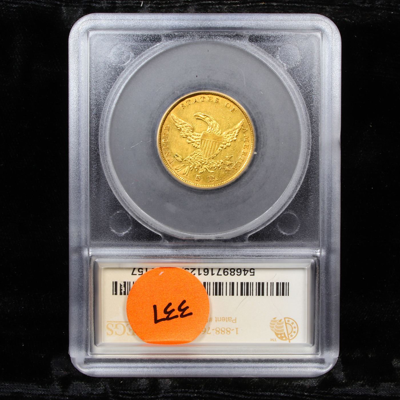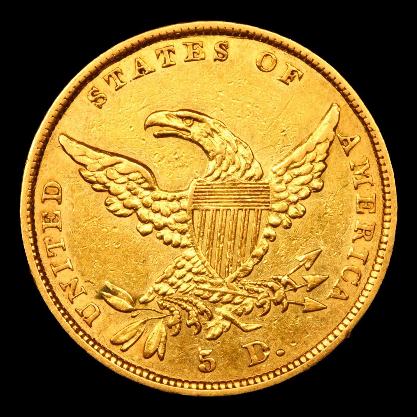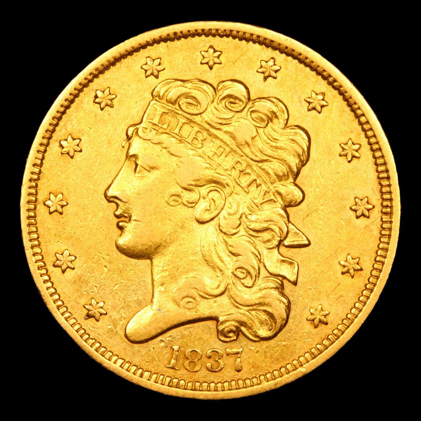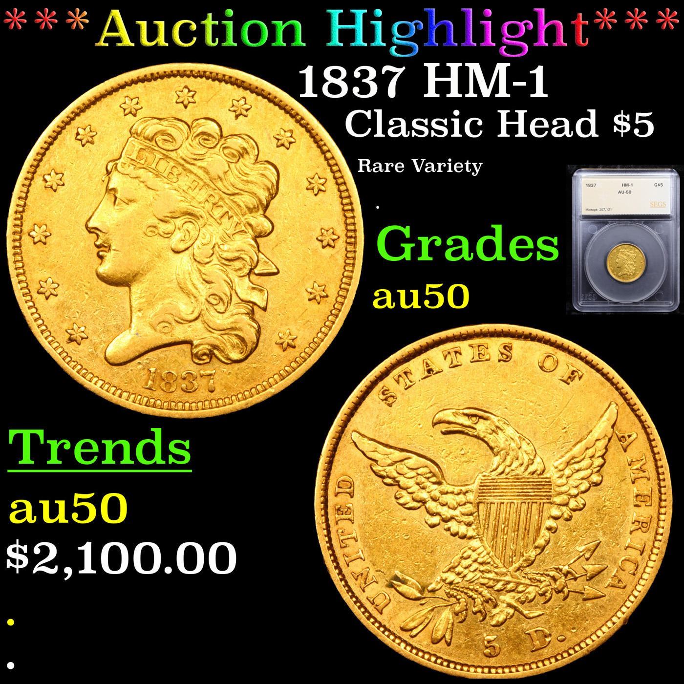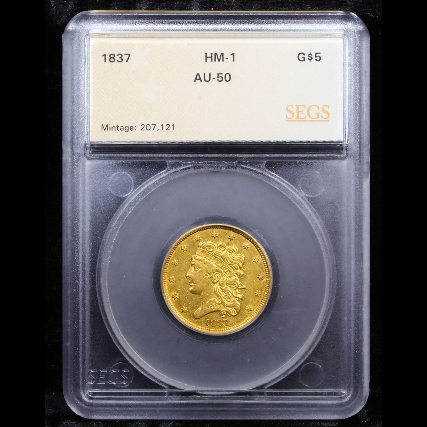 ***Auction Highlight*** 1837 HM-1 Gold Classic Head Half Eagle $5 Graded au50 By SEGS. Up for Auction is the very scarce HM-1 Variety of the 1837 Classic Head $5 Half Eagle. The HM-1 is one of 3 Varieties. It is the Scarcest Variety, comprising about 20% of the surviving Population. The Example at Hand is a Nice About Uncirculated Example with just light wear at the high points and plenty of Mint Luster Remaining. It is worth Noting that the HM-1 is Virtually Unknown in Mint State. This might be among the finest surviving examples of the HM-1 as the Vast Majority of the 100 or so known are XF and Below. A Corey's Pick, Bid to Win, Don't let it get Away Coin