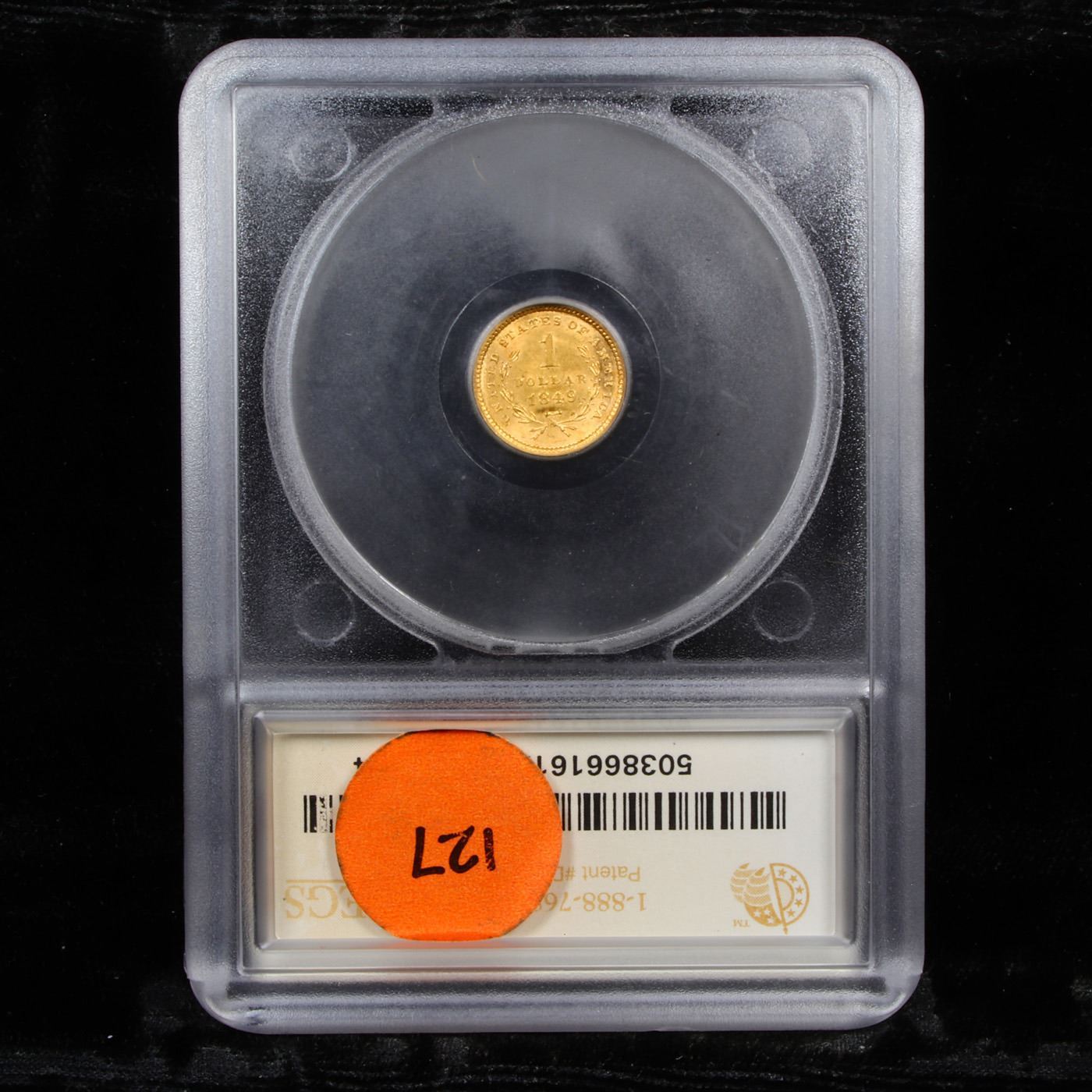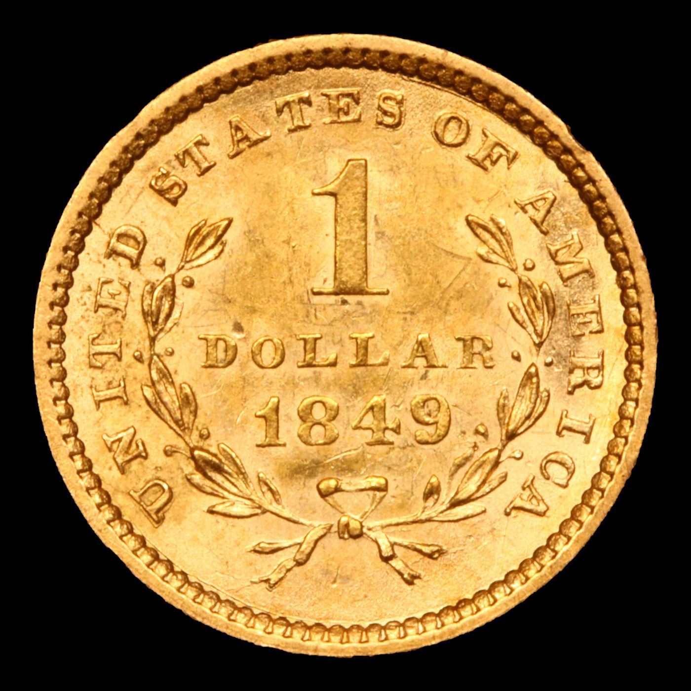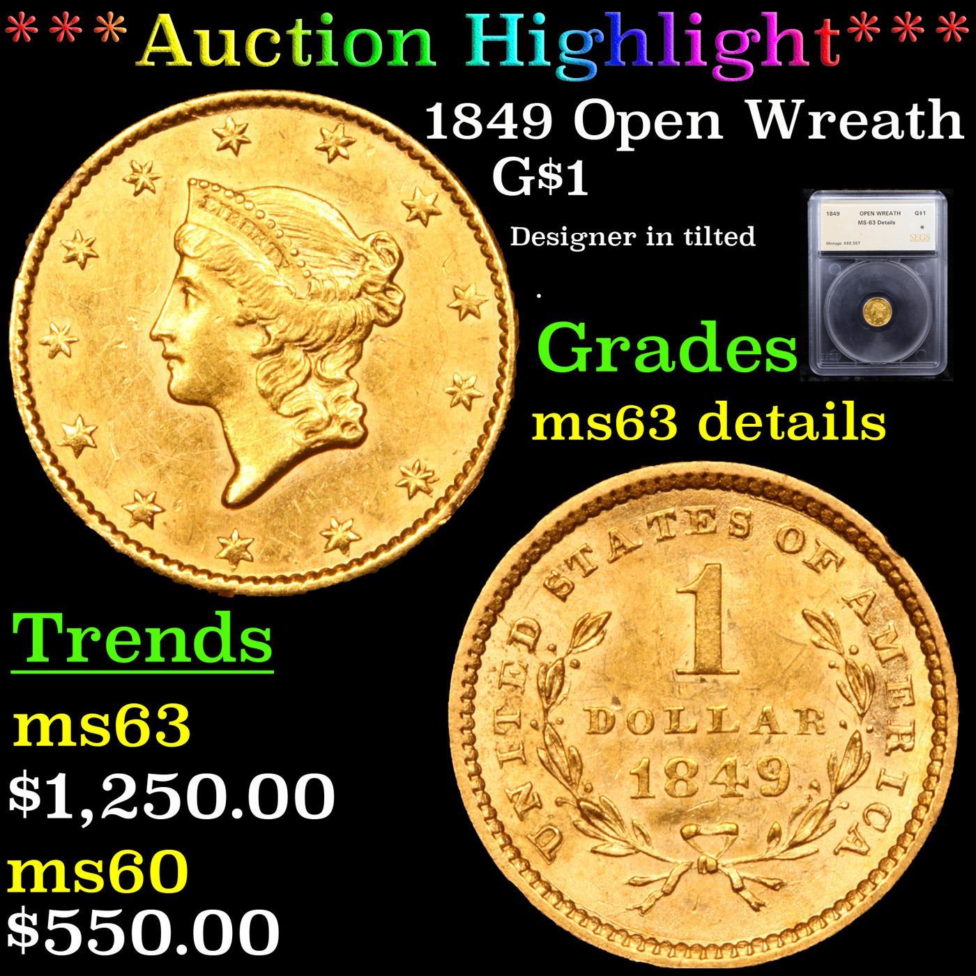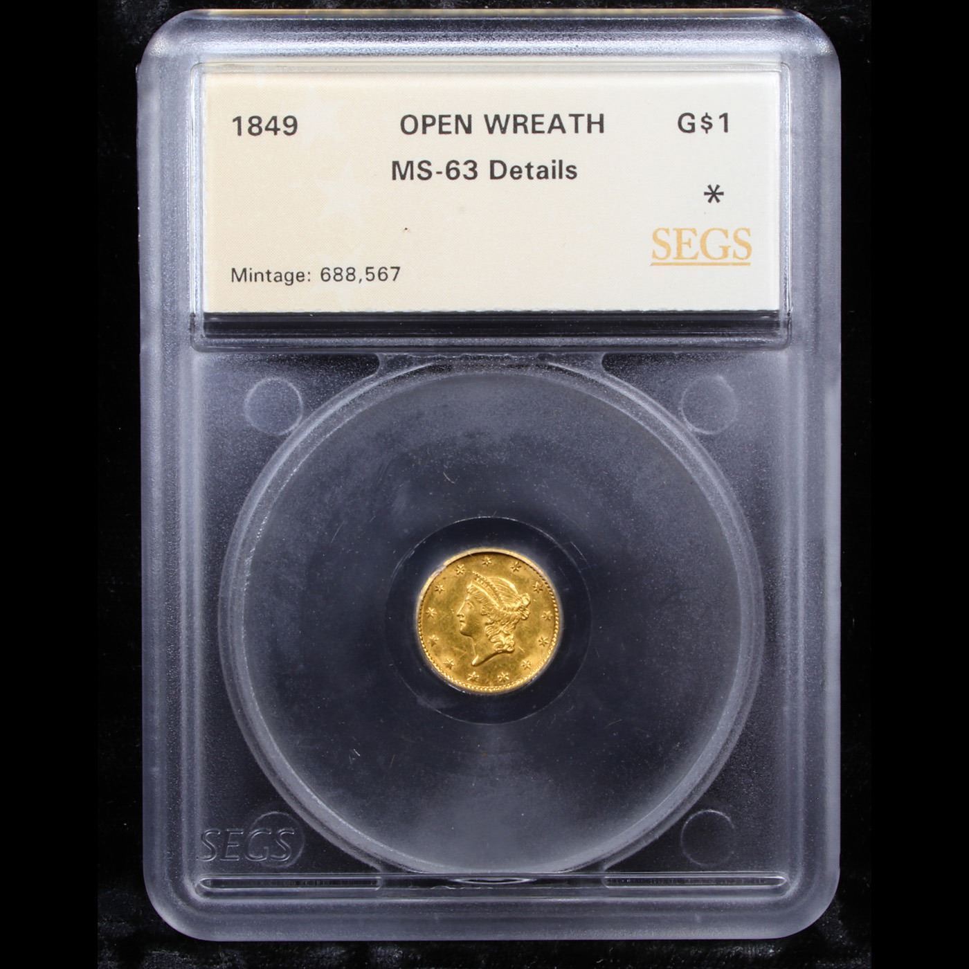 ***Auction Highlight*** 1849 Open Wreath Gold Dollar $1 Graded ms63 details By SEGS.