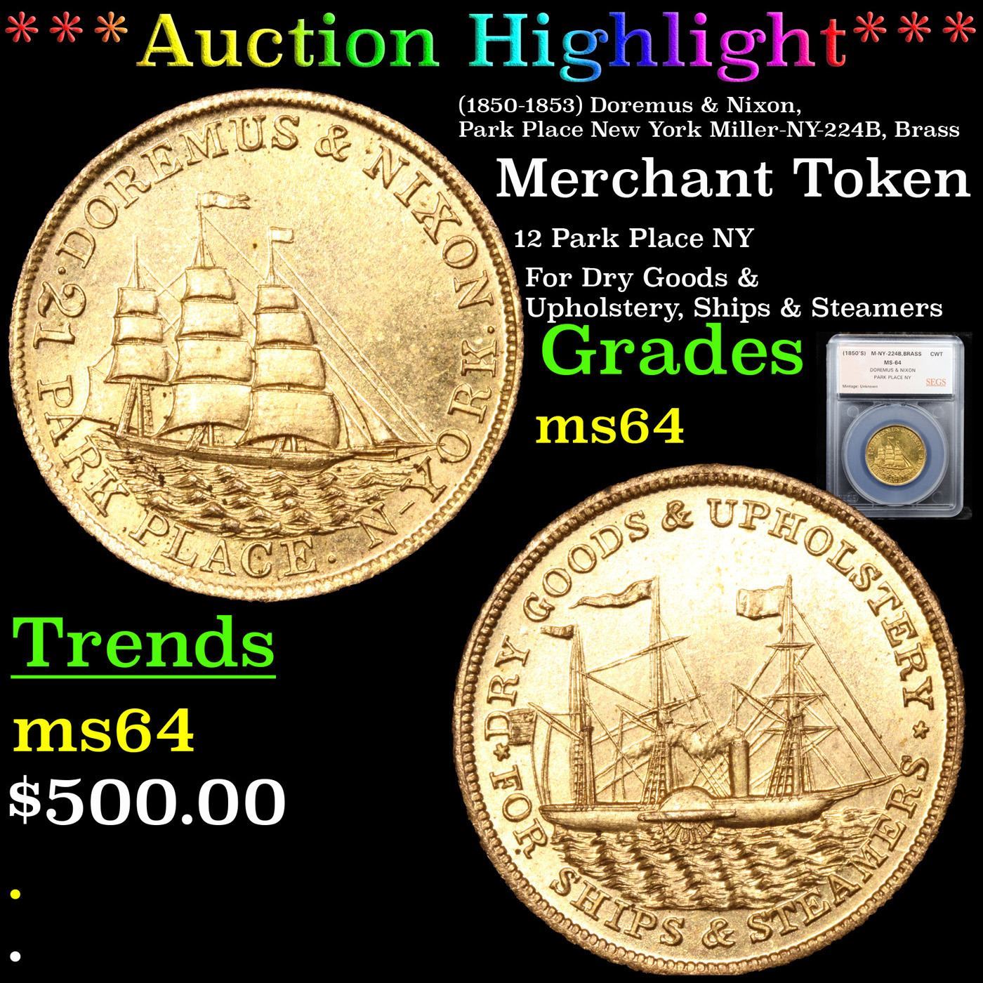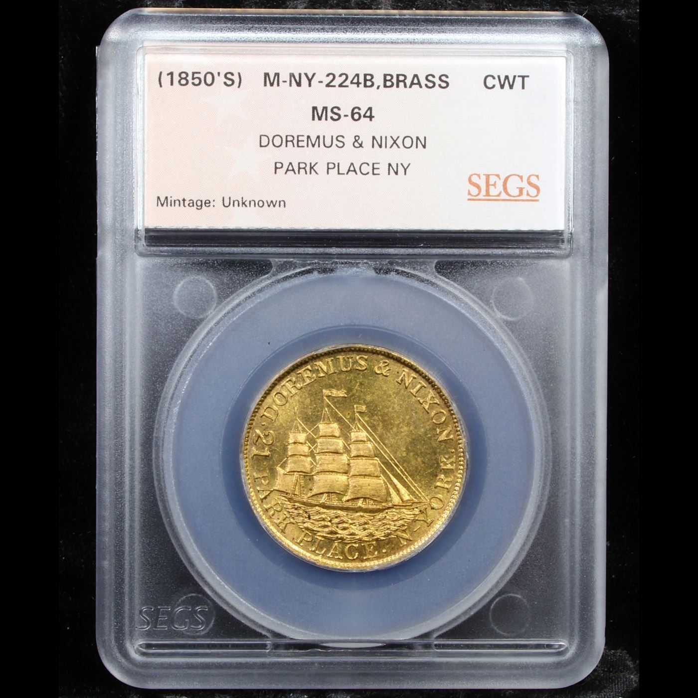 ***Auction Highlight*** (1850-1853) Doremus & Nixon, Park Place New York Miller-NY-224B, Brass Merchant Token Graded ms64 By SEGS. Up for Auction is a Rare (1850-1853) Doremus & Nixon Dry Goods Merchant Token, M-NY-224B, brass, New York; 28 mm. The design elements of this impressive Choice example are sharply detailed and the well-preserved surfaces are lustrous and appealing. A Corey's Pick, Bid to Win Coin