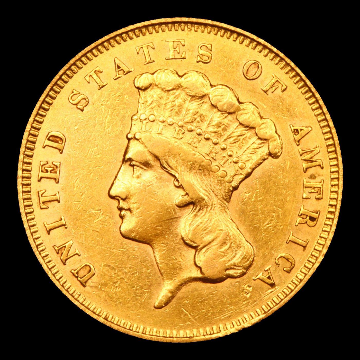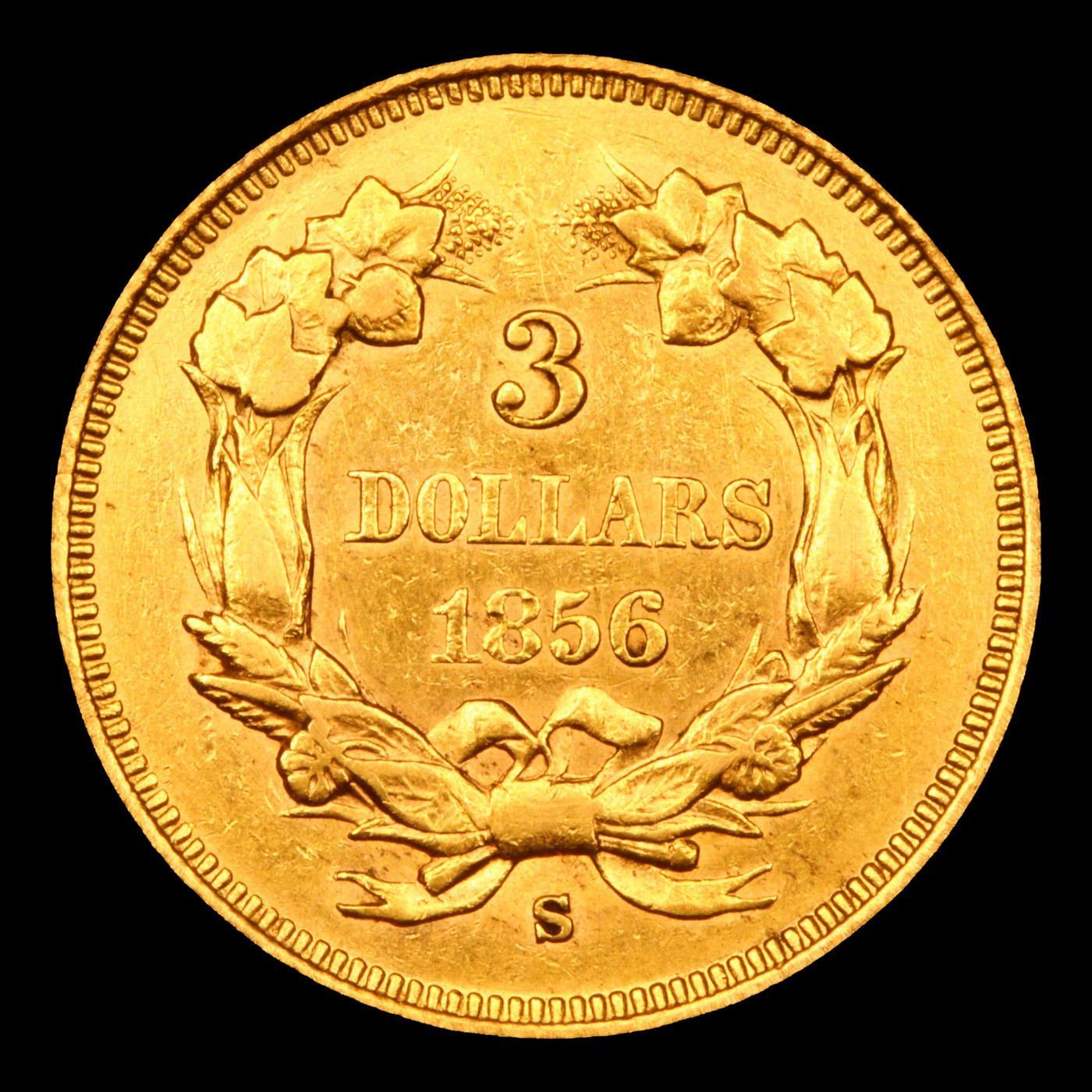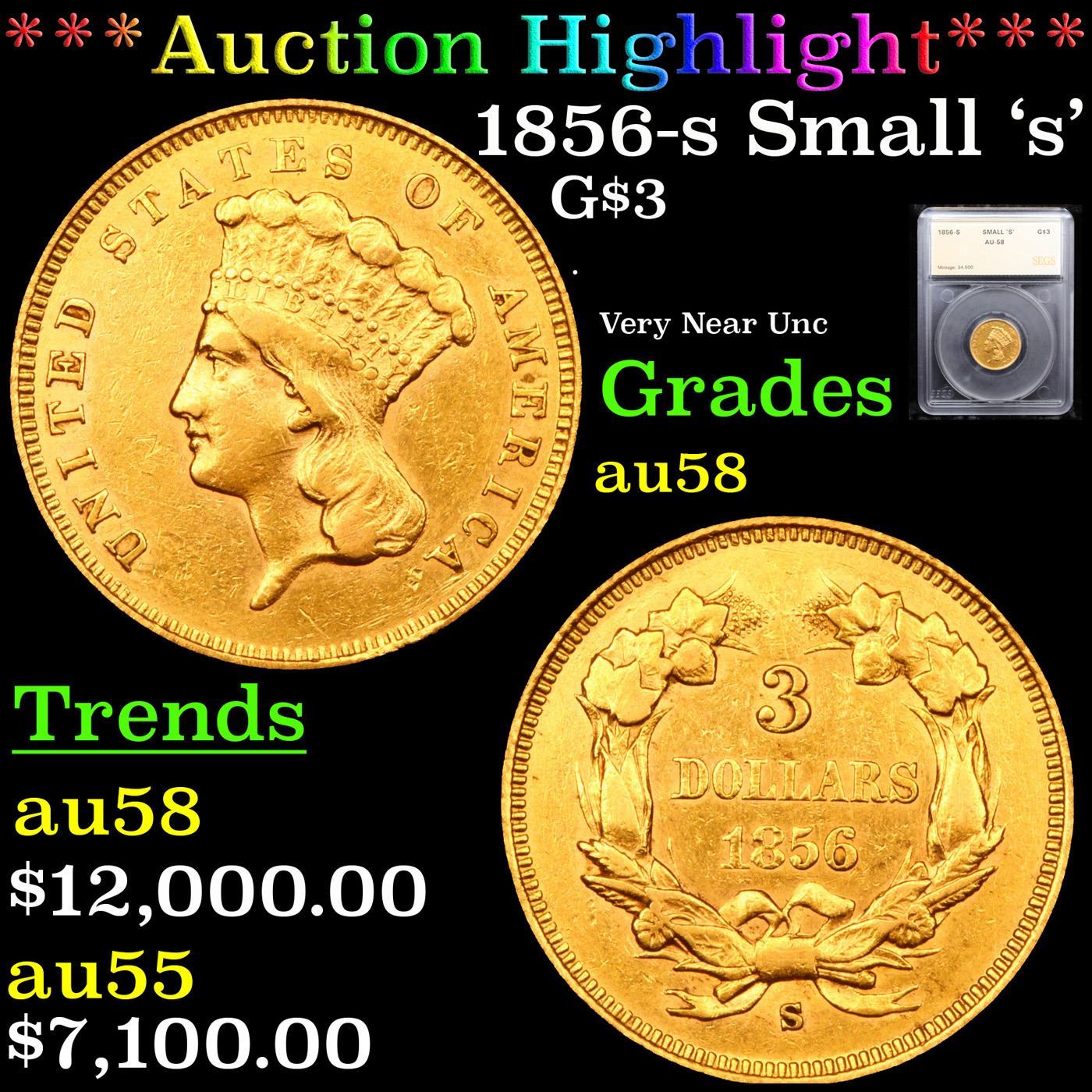 ***Auction Highlight*** 1856-s Small 's' Three Dollar Gold 3 Graded au58 By SEGS. Up for Auction is the very scarce Small s Variety of the 1856-s $3 Princess Head Gold, an issue rare in all regards. The mintmarks on the 1856-S Three-Dollar gold pieces come in three different sizes: Small, Medium, and Large. According to Q. David Bowers and Doug Winter, 80% are of the Medium Mintmark variety, 2-3% are of the Large Mintmark variety, and approximately 15% are of the Small Mintmark variety. Ample satin luster combines with overall sharp definition to define this as a conditionally rare 1856-S three. Perhaps surprisingly for an issue that is so elusive in the finer circulated and Mint State grades, the mintage of 34,500 pieces is actually the fifth highest for circulation strikes of this denomination. Attrition through circulation was high, as one should expect for an early San Francisco Mint gold issue, and the vast majority of the 500 or so coins believed extant are well worn, if not also impaired. At the threshold of Mint State preservation, this attractive Choice AU is sure to catch the eye of astute gold specialists. With only 20 examples surviving in Mint State this Near Mist State example is Tied for 21st Finest. I have included 2 other au58s for your comparison.