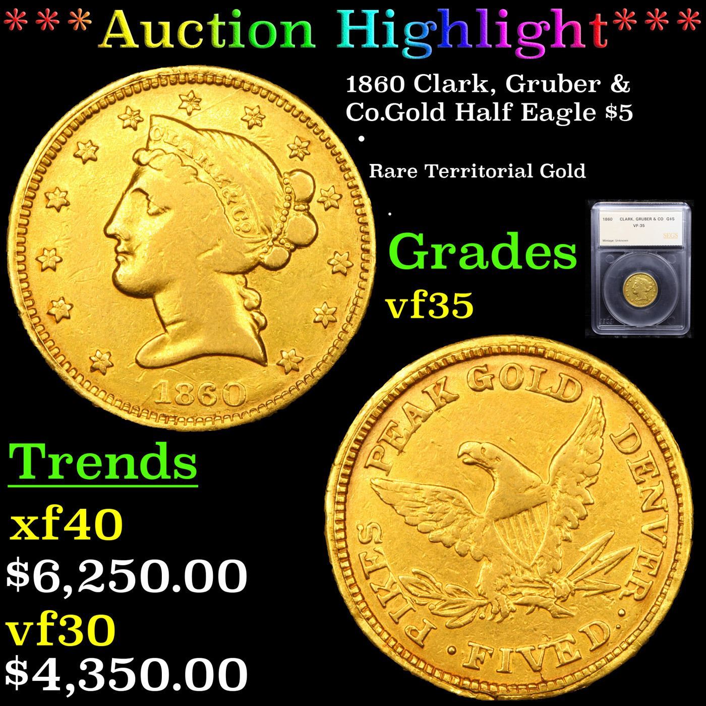 ***Auction Highlight*** 1860 Clark, Gruber & Co.Gold Half Eagle $5 Graded vf35 By SEGS (fc)