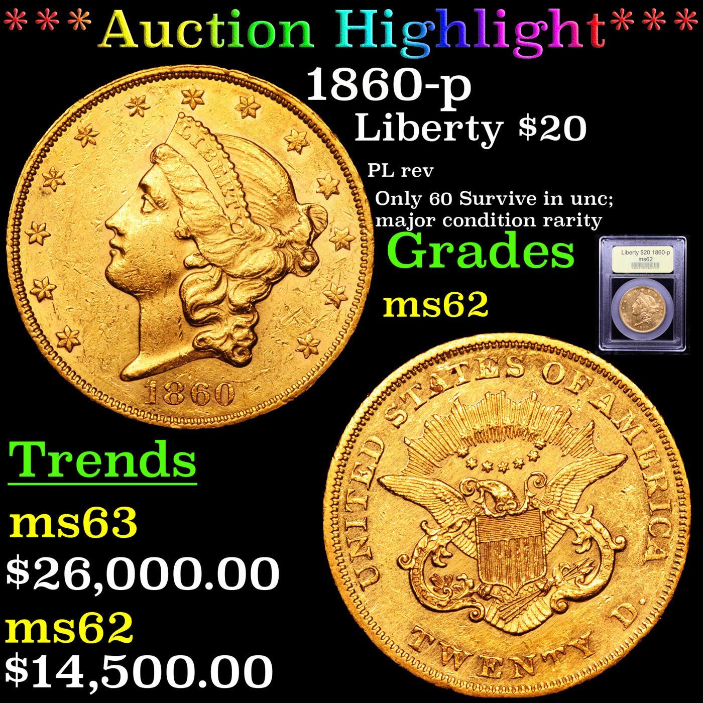 ***Auction Highlight*** 1860-p Gold Liberty Double Eagle $20 Graded Select Unc By USCG. Up for Auction is a terrific 1860 $20 Liberty Head Gold Double Eagle with a PL Reverse. Available in AU condition, the 1860 double eagle is elusive in Mint State. In MS62, this date is somewhat rare, and higher-grade pieces are out of reach for many collectors. This example is beautifully lustrous and well struck, showing radiant yellow-gold mint luster, plus significant reflectivity in the Reverse Fields. There are some faint hairlines and marks commensurate with the Grade, but surprisingly few major distractions are seen for the grade. An important condition rarity for the Liberty double eagle collector. A Corey's Pick, Bid to Win, Don't let it get Away, you might not find its equal Coin. I give this coin my highest recommendation