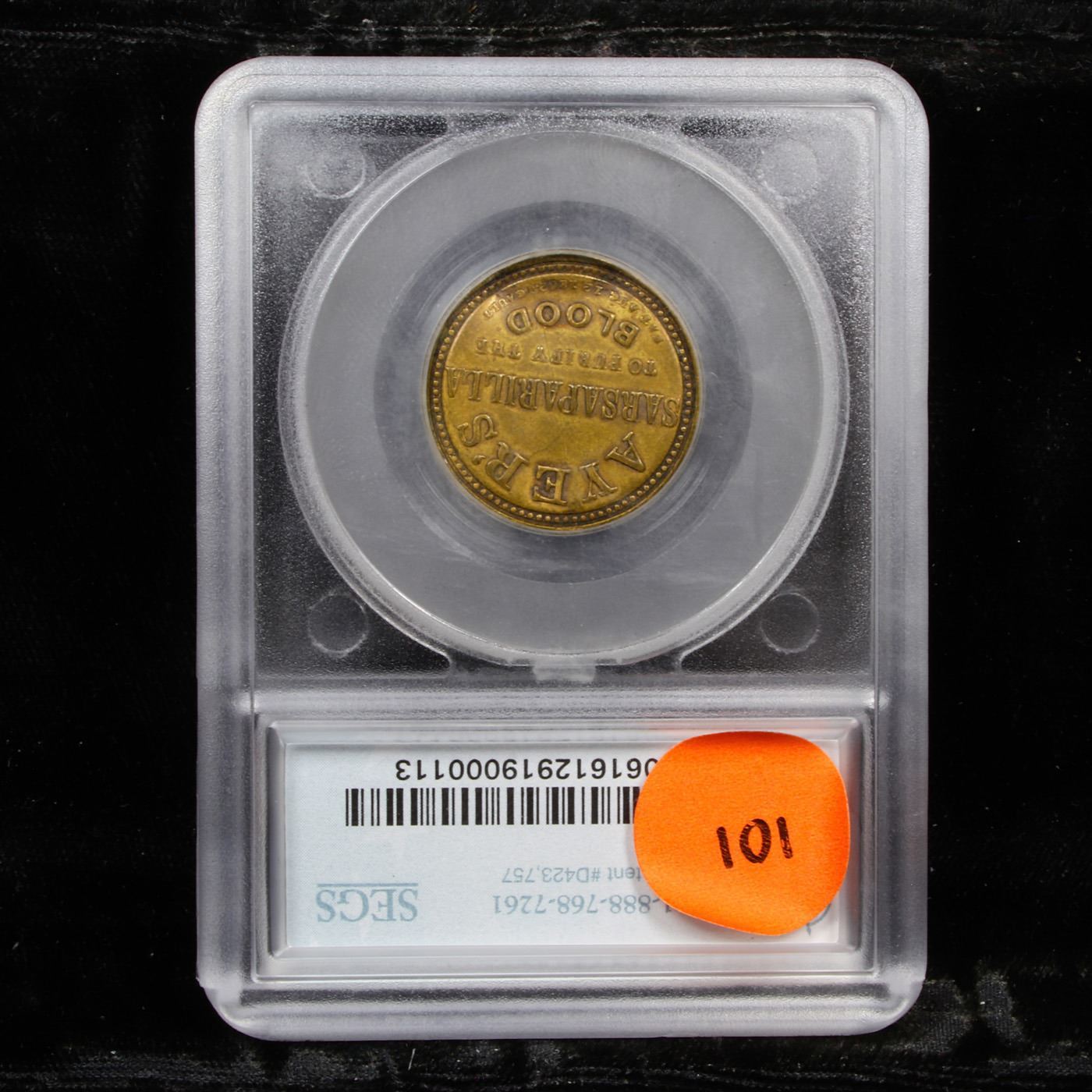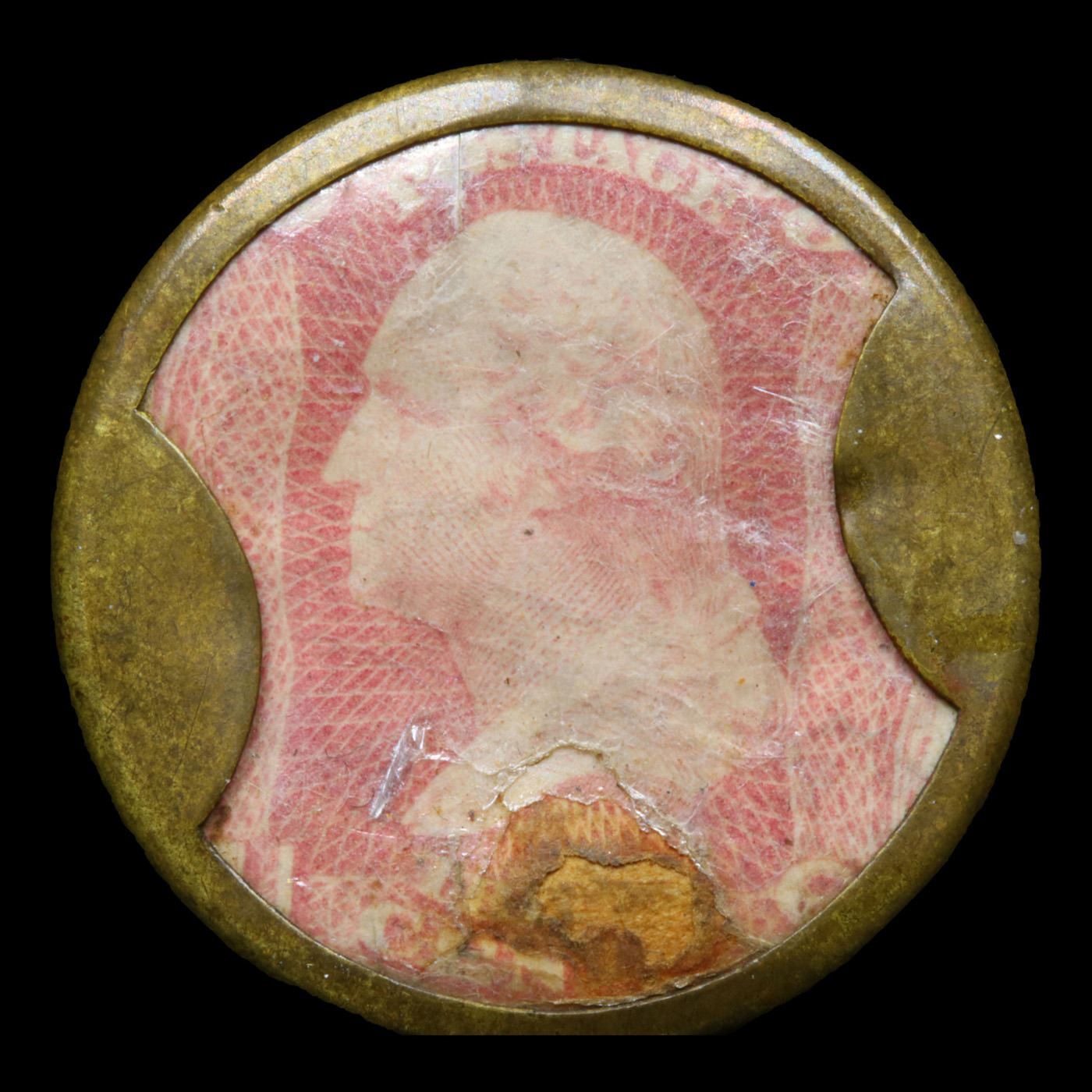 ***Auction Highlight*** 1862 J. Gault’s Encased Postage EP-34B - Ayer’s Sarsaparilla, Large Ayer’s Variety 3c Graded vg8 By SEGS. Up for Auction is One of The Civil War’s Foremost Rarities, The “Encased Postage” coin. While not Technically a Coin, a Note or a Stamp, John Gault’s Encased Postage was king of currency For a Brief Year in 1862. When The Civil war Broke out in 1861, all of the “Hard Currency” quickly Disappeared. But people still needed to purchase a 3¢ loaf of bread, a 1¢ newspaper, a 5¢ quart of milk and countless other goods that required coins. And vendors had to make change when an item’s price was less than a nickel, a dime or a quarter. In some cities, businesses gave customers I.O.Us, private companies created “Civil War tokens” and paper money was cut into several pieces to represent a fraction of a dollar. Clever remedies for sure, but none that were widely used or accepted. All of this radically changed on July 17, 1862, when Congress decided to address the coinage shortage and passed a law that allowed postage stamps to satisfy debts of less than $5. People began to carry stamps in their purses and pockets and used them repeatedly for daily purchases. Vendors gladly accepted the stamps as payment. But all of this hand-to-hand usage quickly resulted in damaged stamps with denominations sometimes unrecognizable. The local post offices would not exchange damaged stamps for new ones, so a remedy was needed. John Gault, a New York entrepreneur, decided he had the best solution. On August 12, 1862, Gault obtained a patent for a “postage stamp case”, or as he named the item in a newspaper advertisement, the “New Metallic Currency. Gault didn’t sell the encased stamps to the public. Instead, he sold them to stores and businesses that needed “coinage” to make change for customers’ purchases. Gault’s profit came from the 20% markup over the face value of the stamp. To increase his potential profit, Gault’s second idea was to inscribe advertising on the back of the encased stamp. He would charge companies who purchased the metallic currency an additional 2¢ for each item. Encased stamps were widely accepted in the general commerce realm until later in 1862 when the government issued “fractional currency”. This legitimate, government-sanctioned currency quickly eliminated the coin shortage. Having no other value than the stamp, people tore apart the encasements of their metallic currency to remove the stamp to use as postage. Thus the scarcity of the 1862 encased stamps today. The Example being offered today is EP34B, Large Ayer’s, Ayer’s Sarsaparilla, 3c Rose Colored Washington Stamp, with the Advertising Slogan “To Purify the Blood” The case has a nice Patina, with a slight dent on the bottom at 6:00, The Mica & Stamp are 90% intact with a small section at 6:00 damaged. The Stamp is Clear and the Case pleasing. A Corey's Pick, Bid to Win, Don't let it get Away Coin