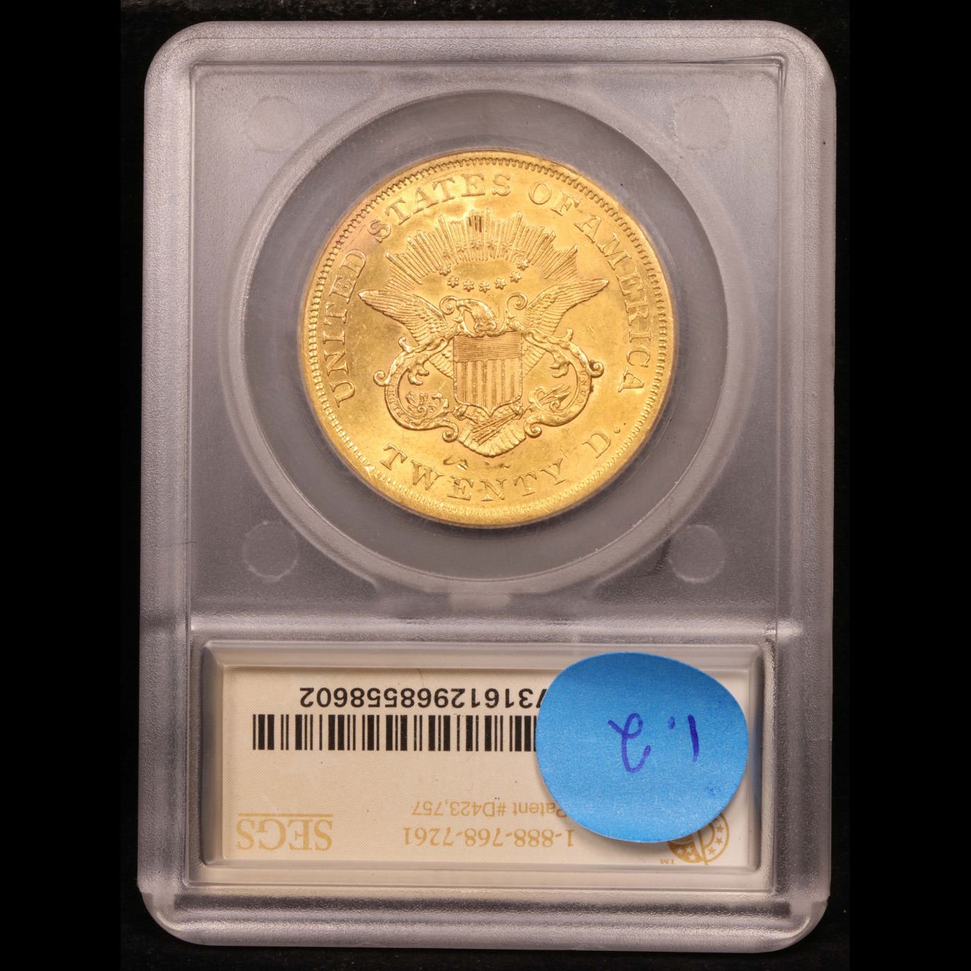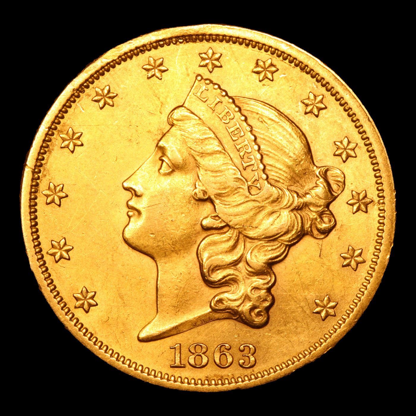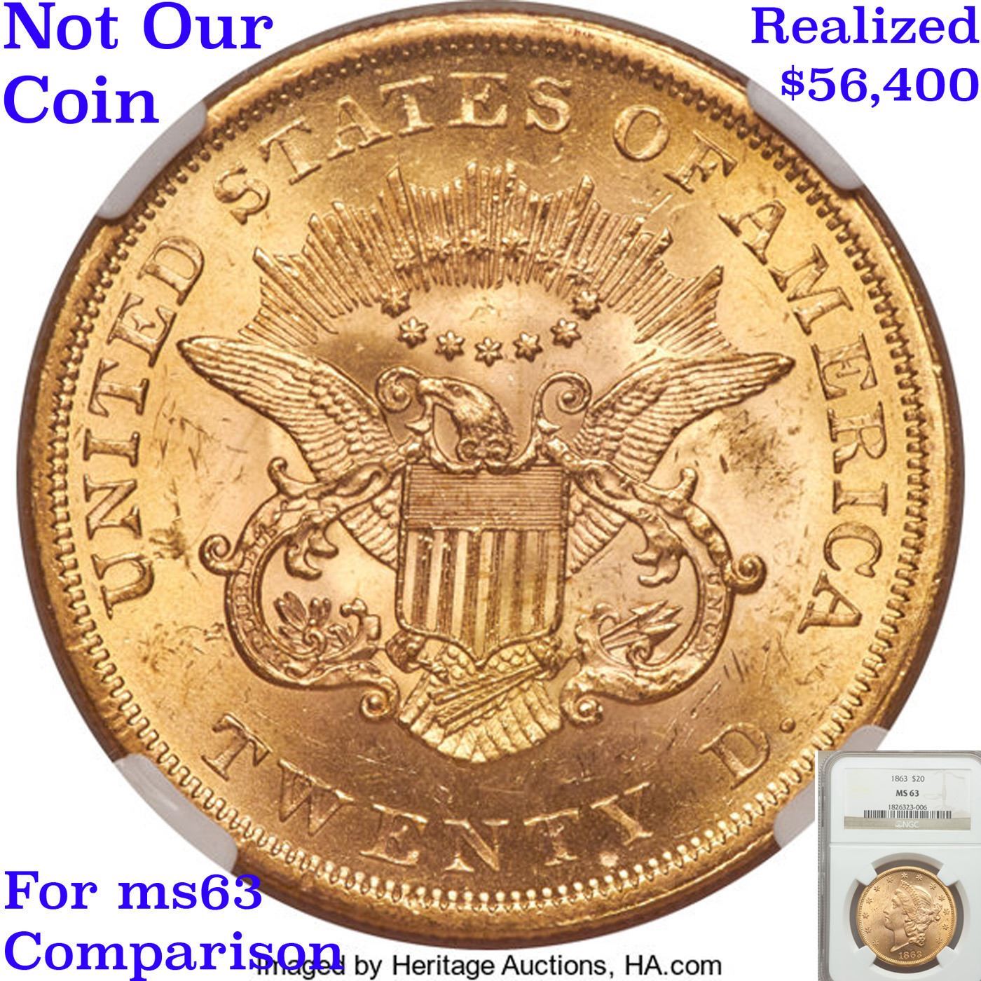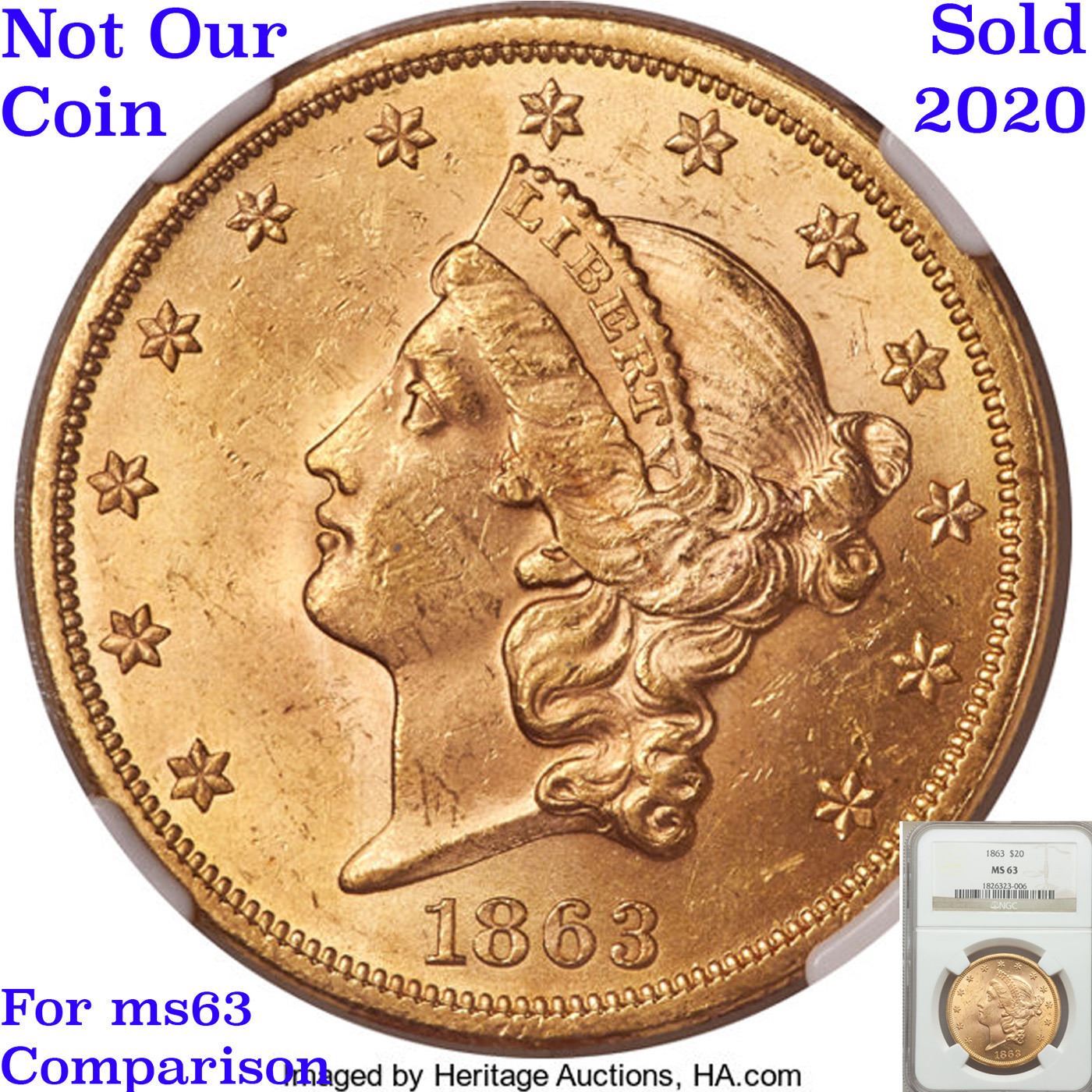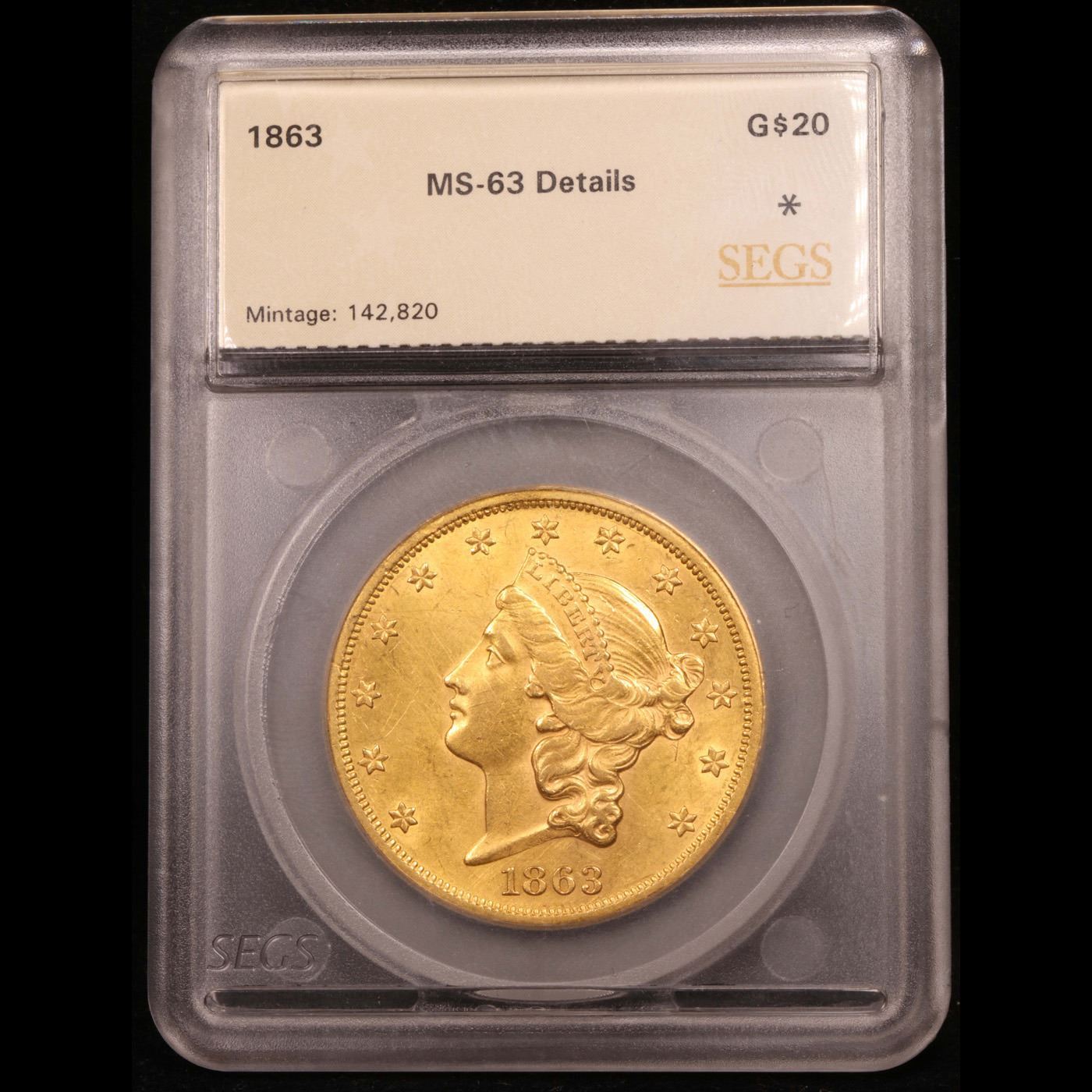 ***Auction Highlight*** 1863-p Gold Liberty Double Eagle $20 Graded ms63 details By SEGS. Up for Auction is an Ultra Scarce Civil War 1863-p $20 Double Eagle. Outstanding radiant luster and an unusual degree of eye appeal for the grade. The surfaces exhibit some light hairlines, evenly distributed across the surfaces, but without any marks worthy of specific mention, but which require the details grade. Most mint state pieces are found in the lowest mint state grades and tend to have a somewhat rough appearance. The example at hand has far superior eye appeal, equal to its higher grade. Nicely struck, and a coin that would be hard to beat for value as the few other known examples in higher grades would command substantial premiums above ours. Just under 143,000 pieces were struck, but only 20 pieces in mint state across all grades. An exceptional example of this Civil War date. Ive included 2 other ms63 examples for your comparison. A Corey's Pick, Bid to Win, Don't let it get Away, you might not find its equal Coin. I give this coin my highest recommendation