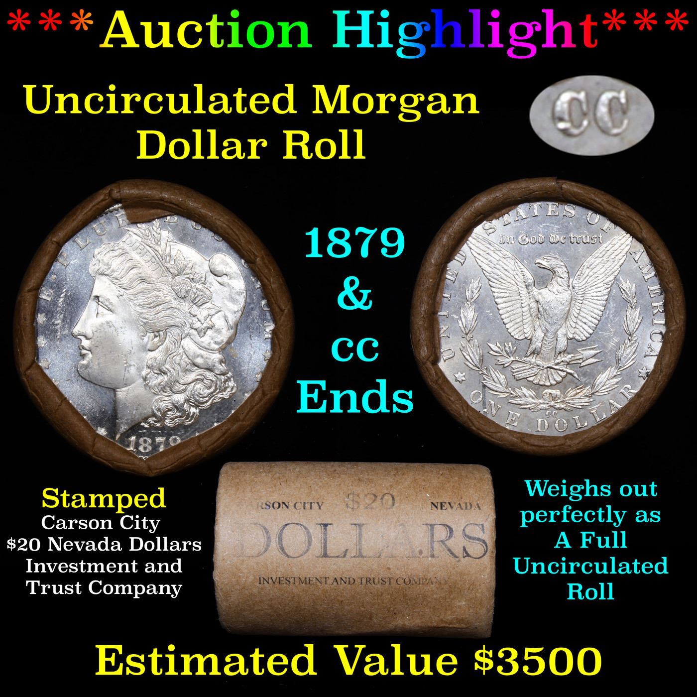 ***Auction Highlight*** 1879 & CC Uncirculated Morgan Dollar Shotgun Roll PL Ends. Uncirculated Morgan Dollar Roll, Superb Ends, Carson City, Nevada Investment and Trust Co wrapper. Weighs Perfectly as a Uncirculated Roll.