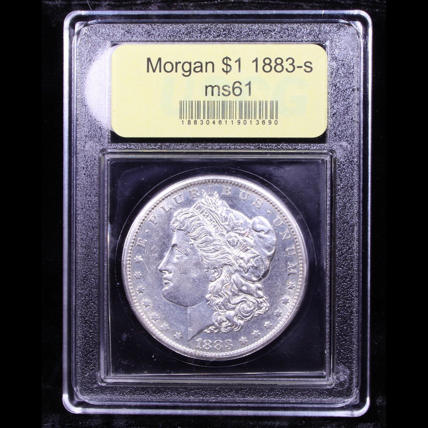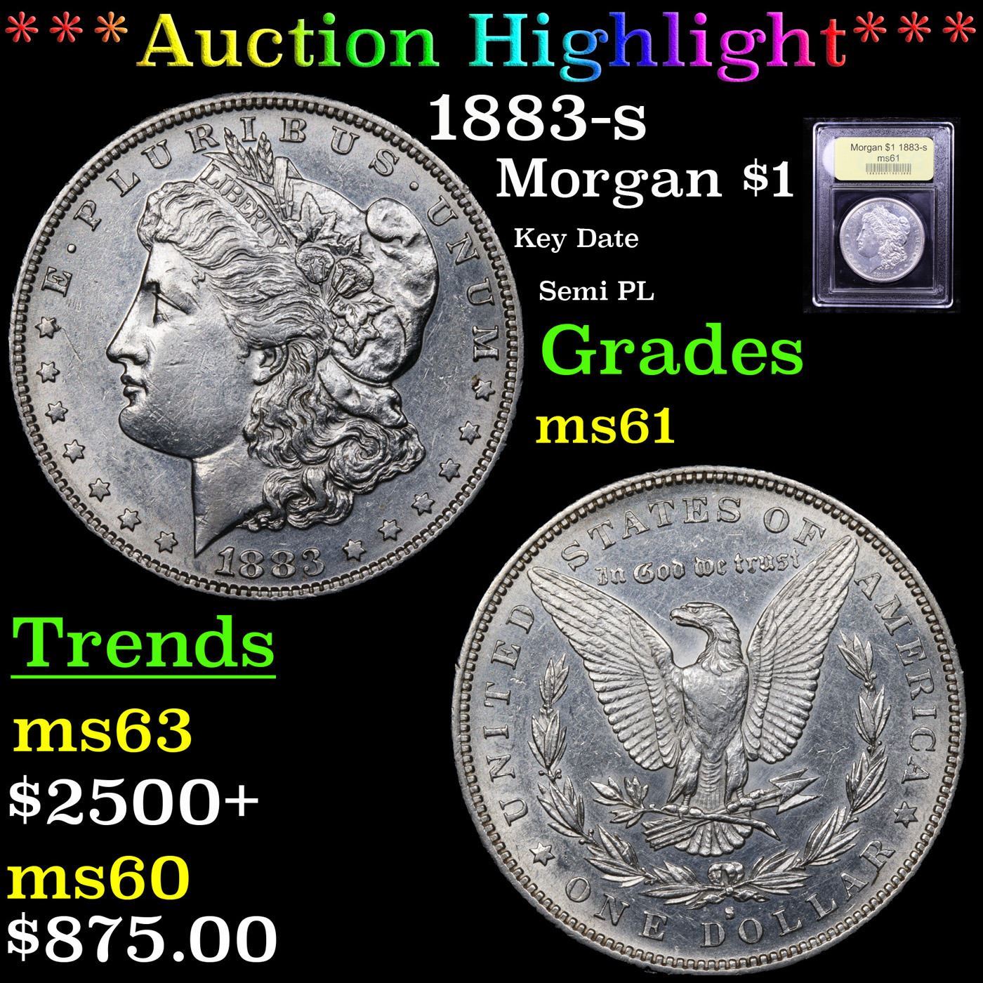 ***Auction Highlight*** 1883-s Morgan Dollar $1 Graded BU+ By USCG. Up for Auction is a Scarce 1883-s Morgan Dollar in ms61. Predominantly brilliant, semi Proof Like and virtually untoned surfaces. Here is an attractive near example of this more conditionally challenging issue in the early San Francisco Mint Morgan dollar series.
