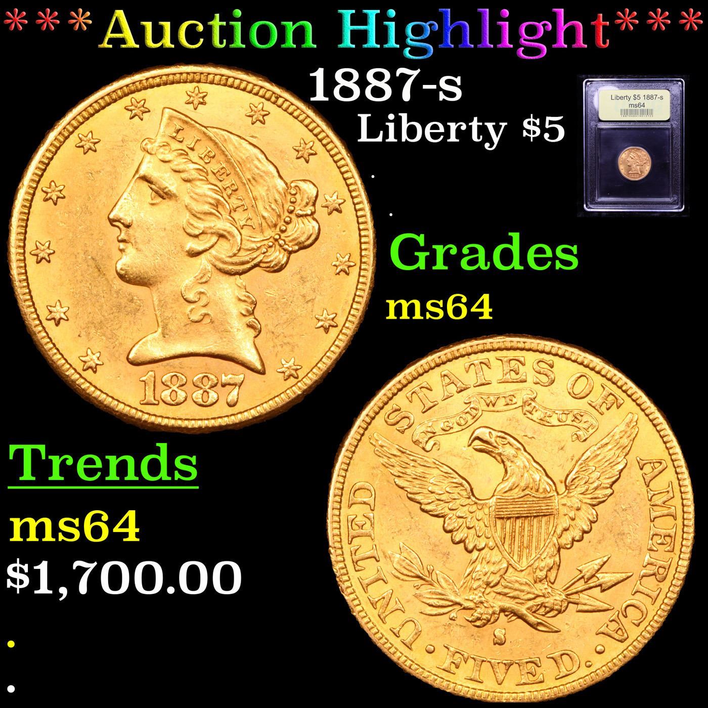 ***Auction Highlight*** 1887-s Gold Liberty Half Eagle $5 Graded Choice Unc By USCG.