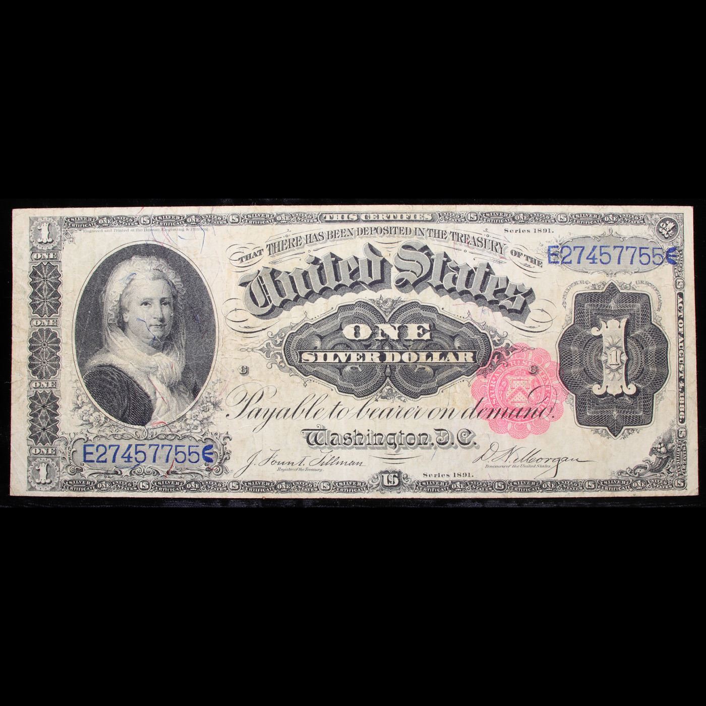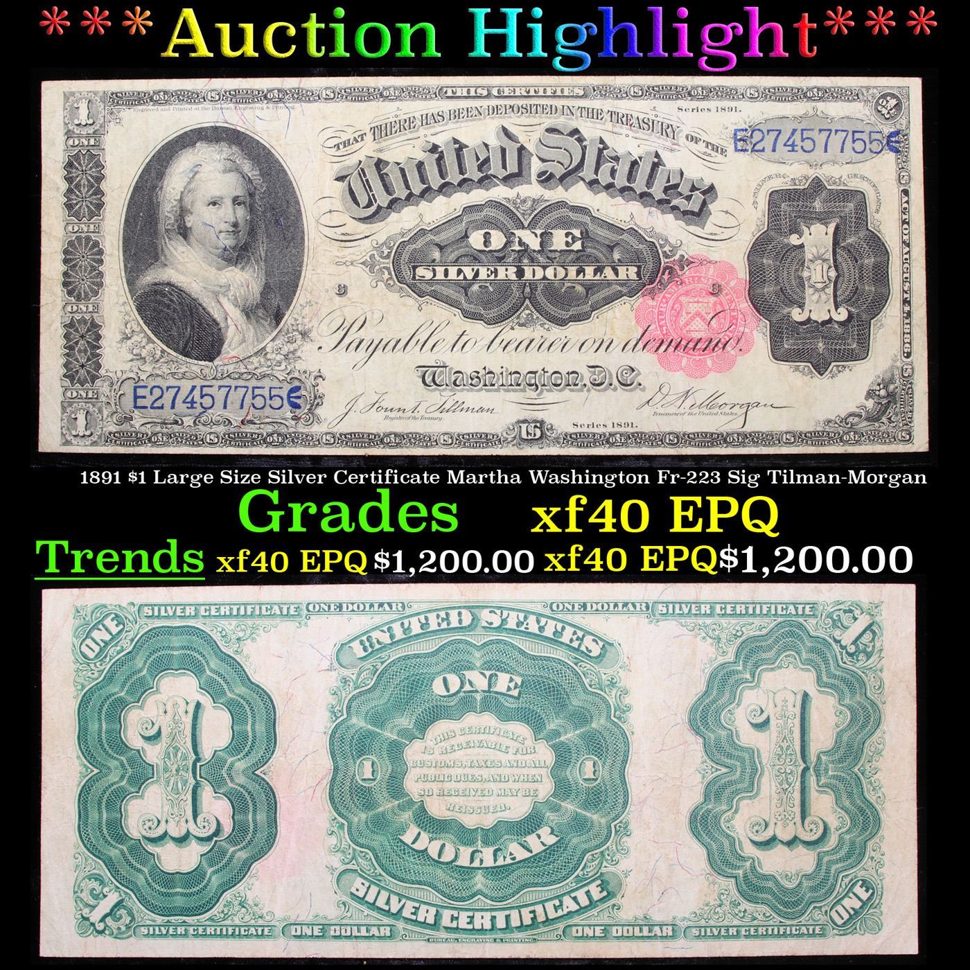 ***Auction Highlight*** 1891 $1 Large Size Silver Certificate Martha Washington Fr-223 Sig Tilman-Mo