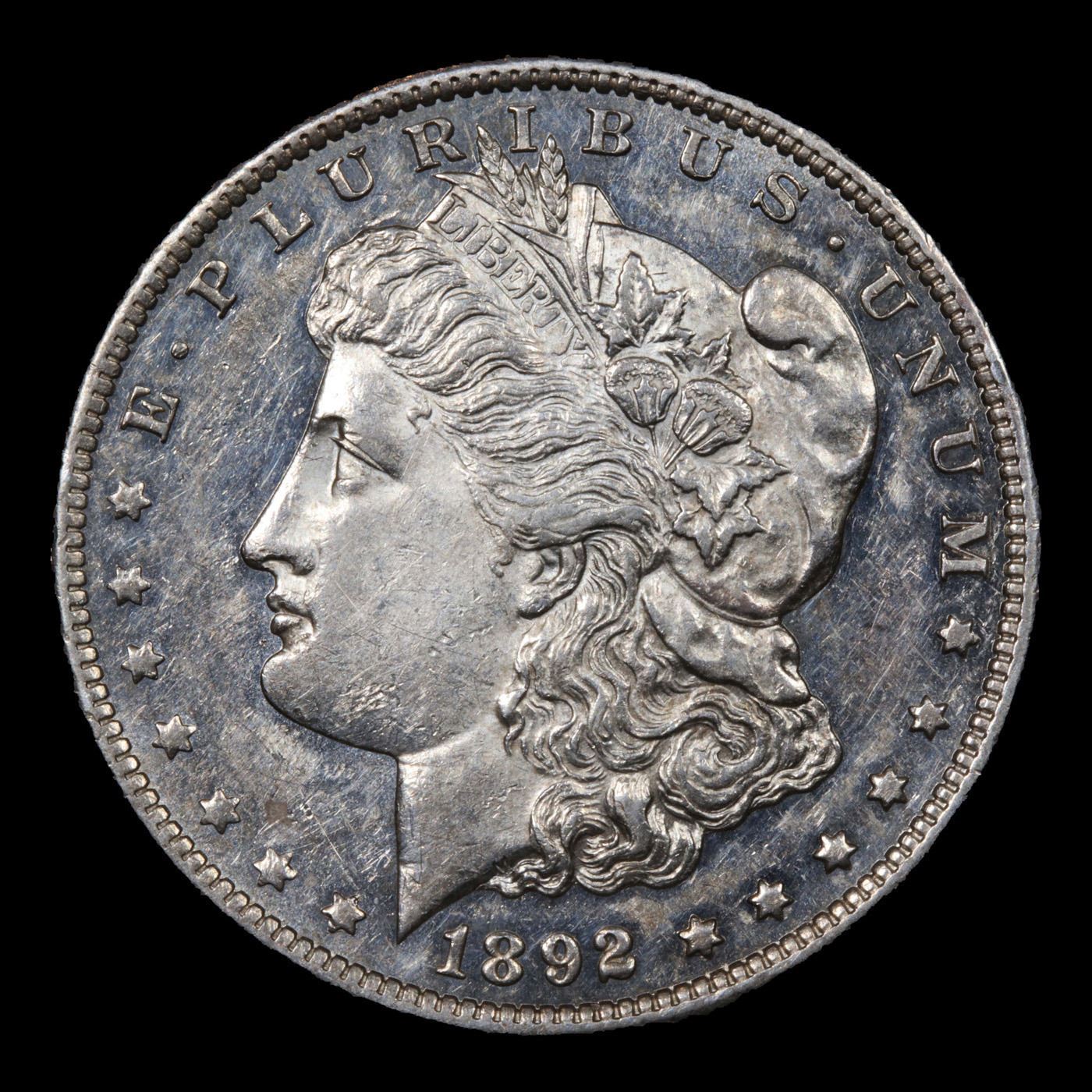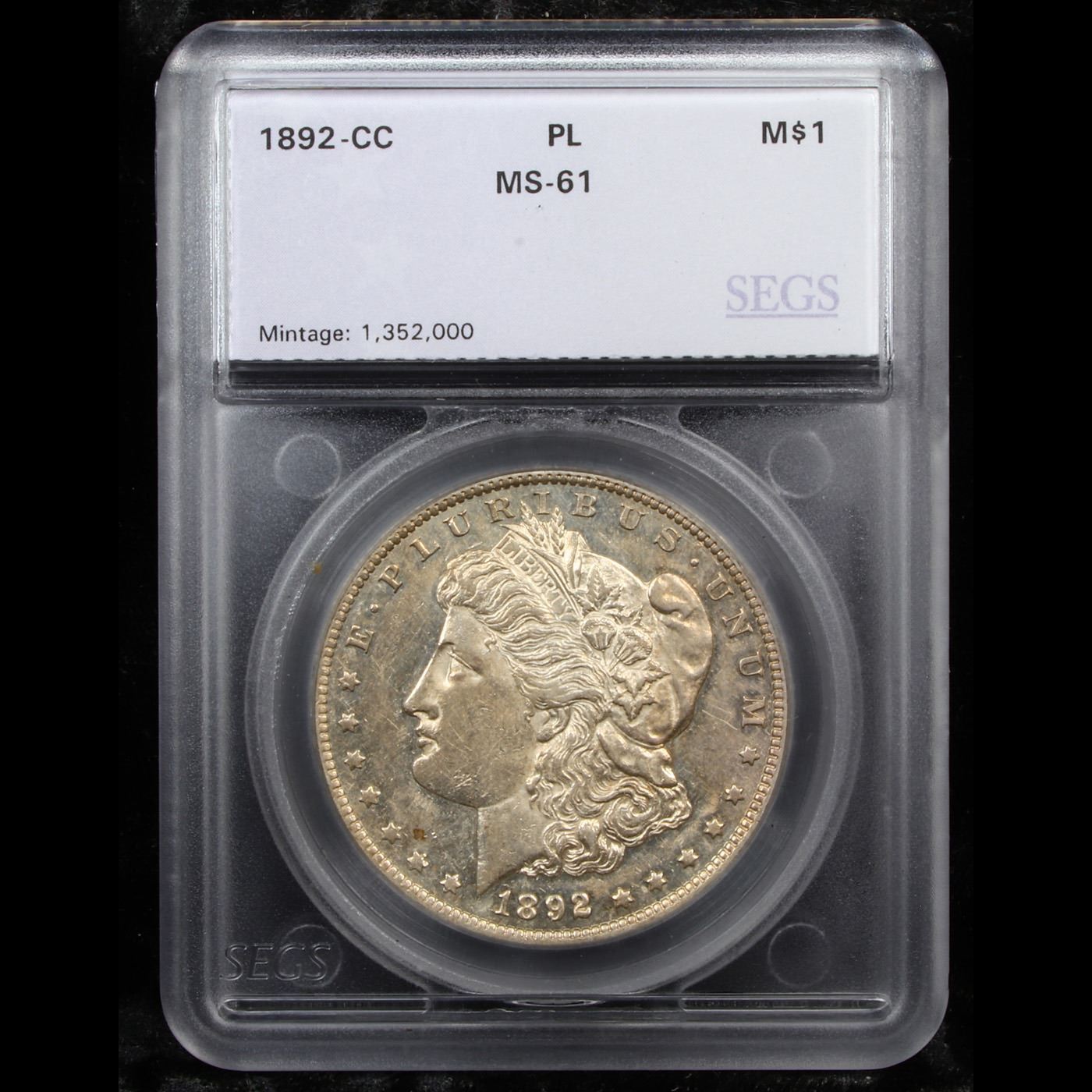 ***Auction Highlight*** 1892-cc Morgan Dollar $1 Graded ms61 pl By SEGS. Liberty's thickly frosted portrait and the snow-white eagle and wreath jump out from the surrounding mirrors, which show significant depth-of-field. The coin is almost entirely brilliant, with very lightly toned surfaces. Both sides are show contact with other coins or foreign objects commensurate with the grade. The 1892-CC Morgan dollar claims a mintage of 1.3 million coins.