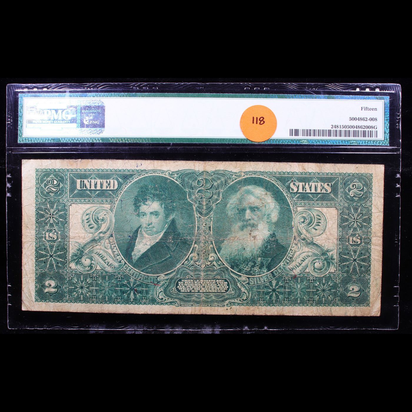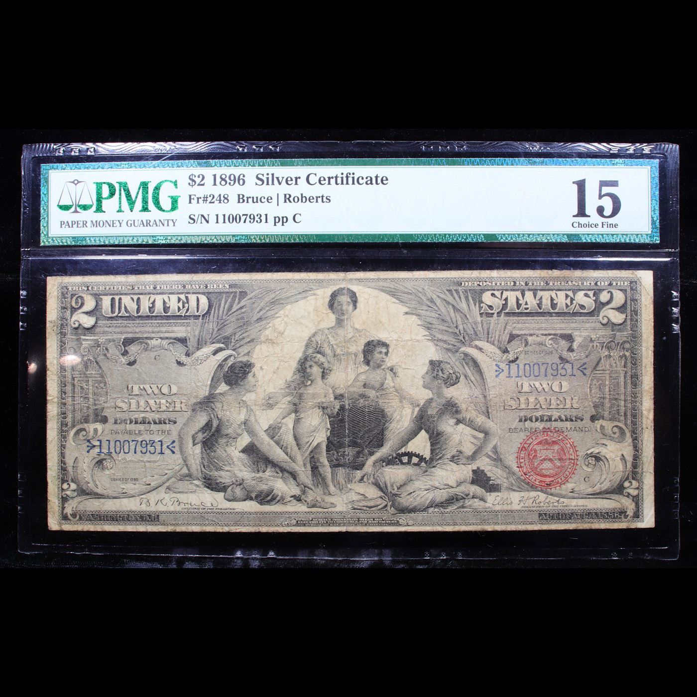 ***Auction Highlight*** 1896 $2 Silver Certificate Fr-248 "Educational Series" Samuel Morse & Robert Fulton Graded f15 By PMG. In 1896, the U.S. Treasury printed Silver Certificates with beautiful designs depicting educational motifs. Known as the “Educational Series,” each of these notes is a numismatic masterpiece. They’re also incredibly difficult to come by. We’ve managed to Bring to auction a $2 note depicting an allegorical figure of Science presenting Steam and Electricity to Commerce and Manufacture, paired with a reverse featuring Samuel Morse (inventor of the Morse code and telegraph) and steamship pioneer Robert Fulton! Due to their theme, these notes became known as “Two Dollar Eds,” although in some circles they are known as “Fulton” or “Morse” notes in reference to the portraits of the two famous Americans on the back of the bill. Still, it’s the beautifully and intricately-engraved images on the front of the bill that are truly inspiring – making it arguably the most classically beautiful two-dollar bill ever printed! In the center is the allegorical figure of Science presenting two children, Steam and Electricity, to the more mature figures of Commerce on the left and Manufacture on the right. Issued just before the Turn of the Century, the novelty of Steam and Electricity was still new and their portrayals as youths, while Science, Industry, and Commerce are all mature women effectively illustrates where America was at that time regarding these new forms of power. In the book 100 Greatest Currency Notes by Q. David Bowers, the $2 Educational Note is ranked #11.