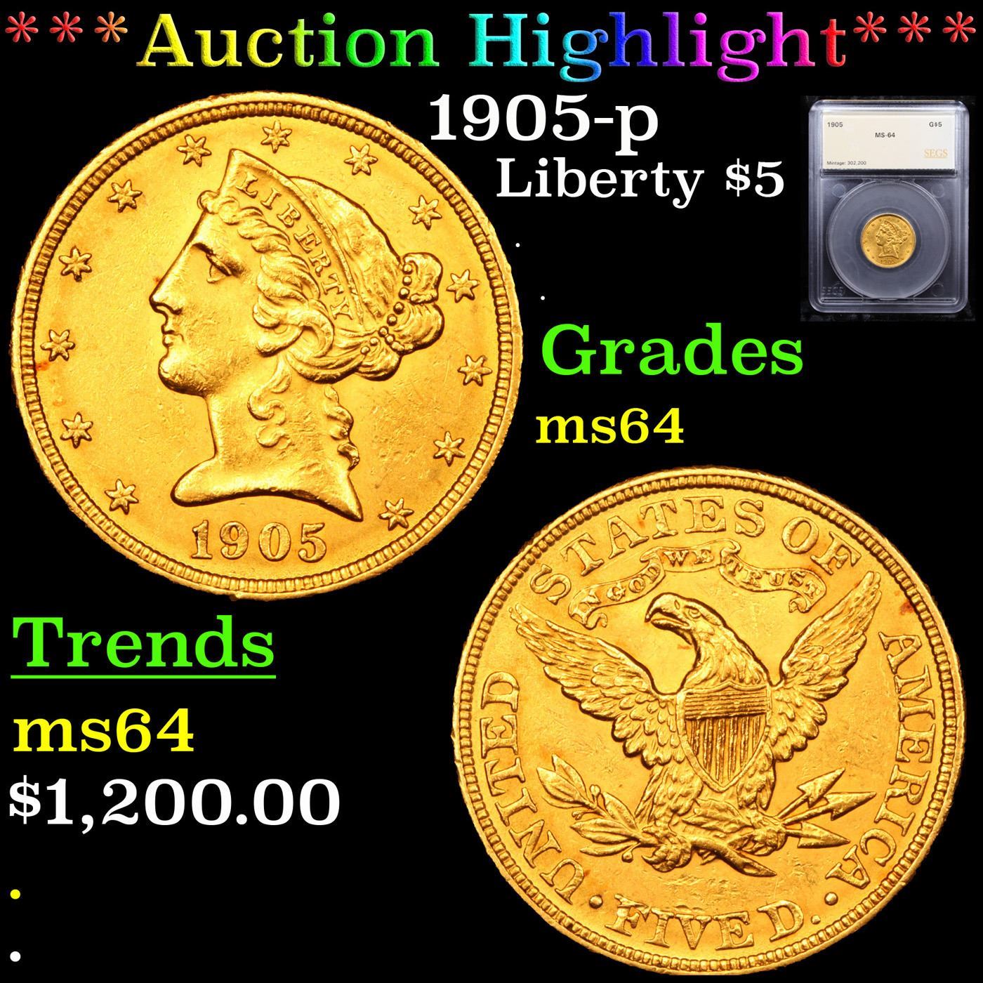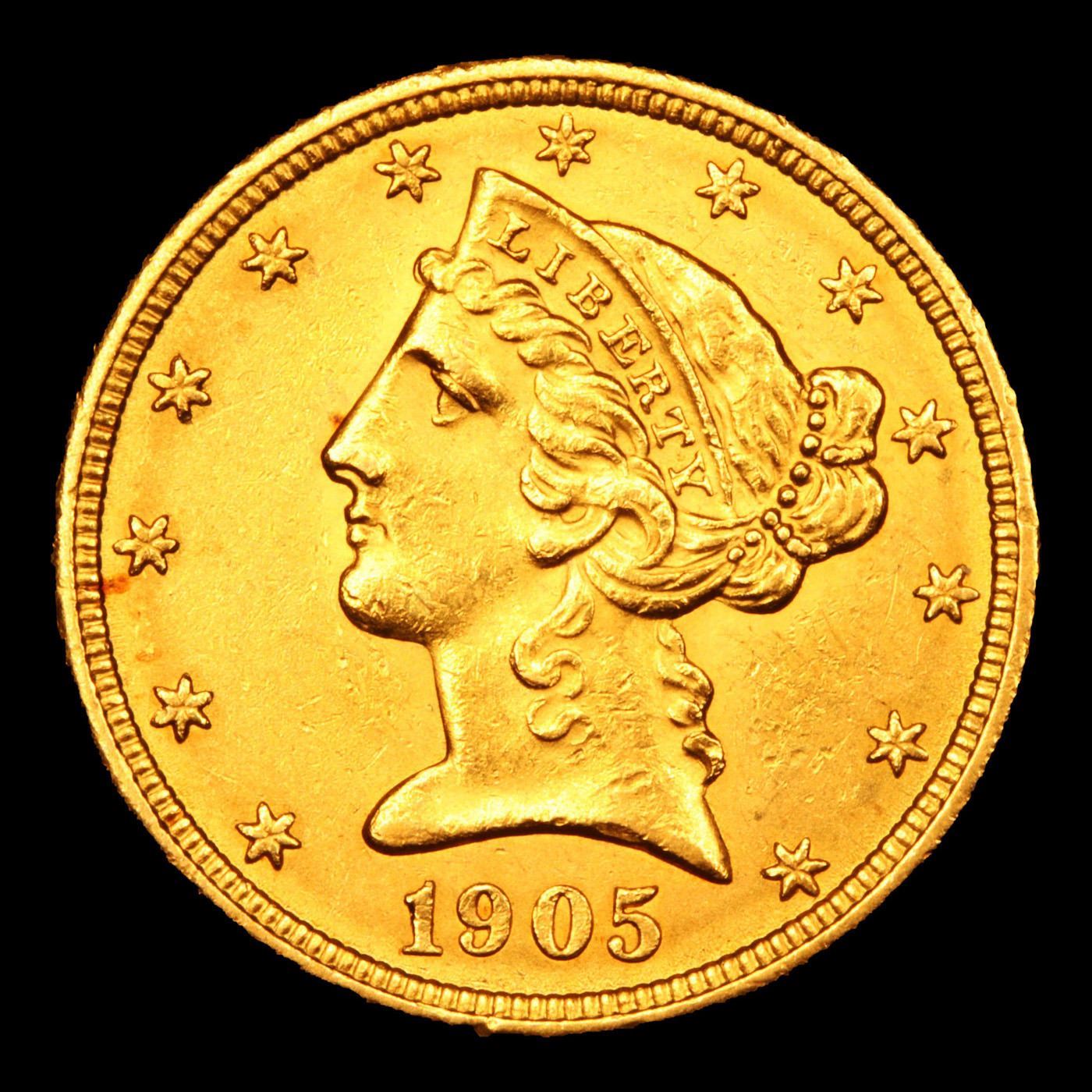 ***Auction Highlight*** 1905-p Gold Liberty Half Eagle $5 Graded ms64 By SEGS.