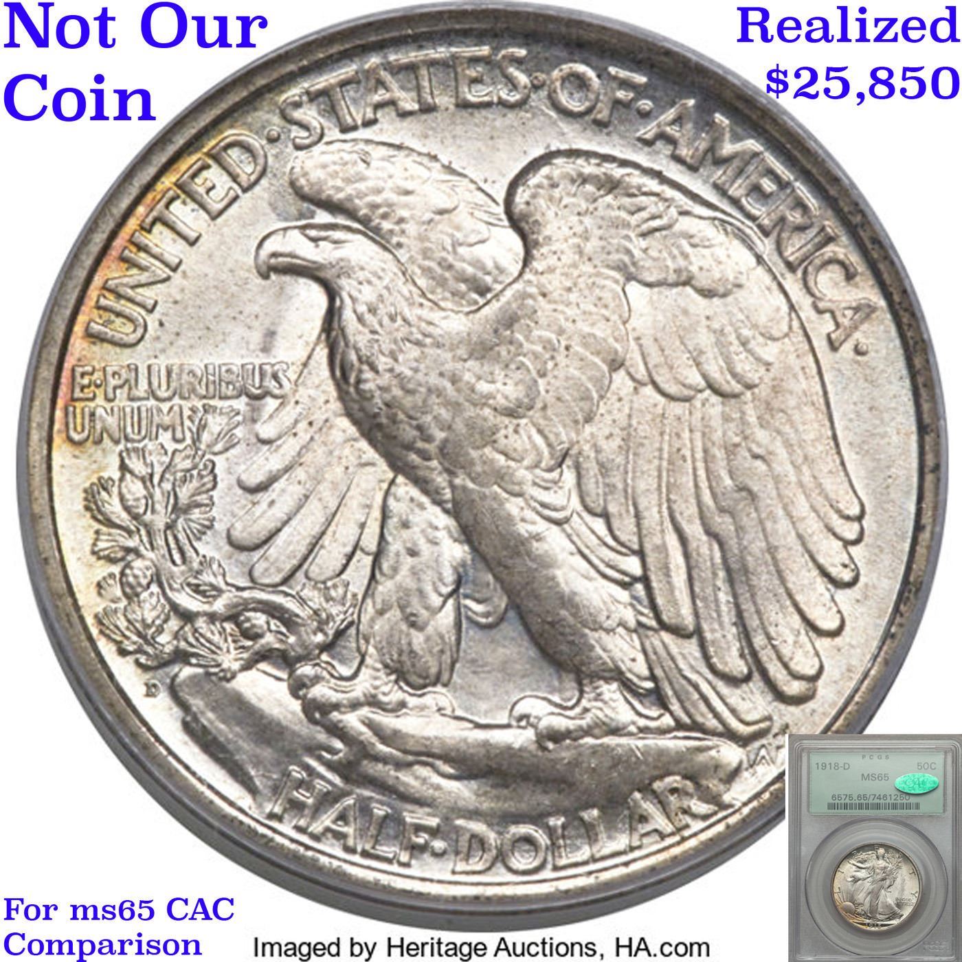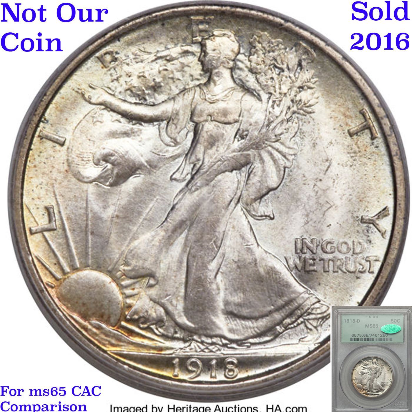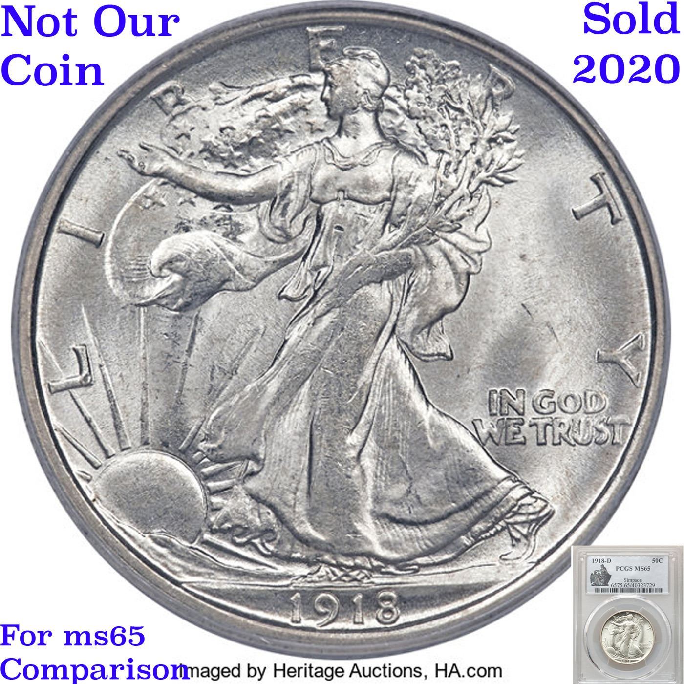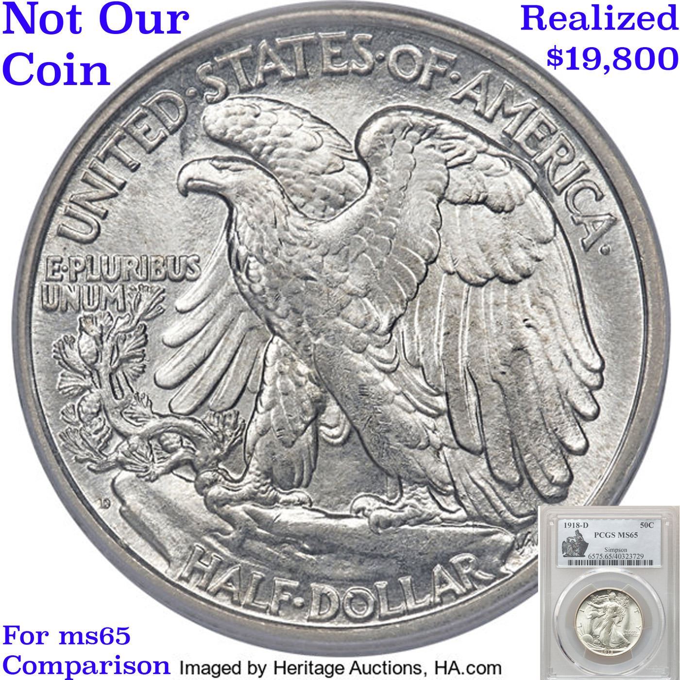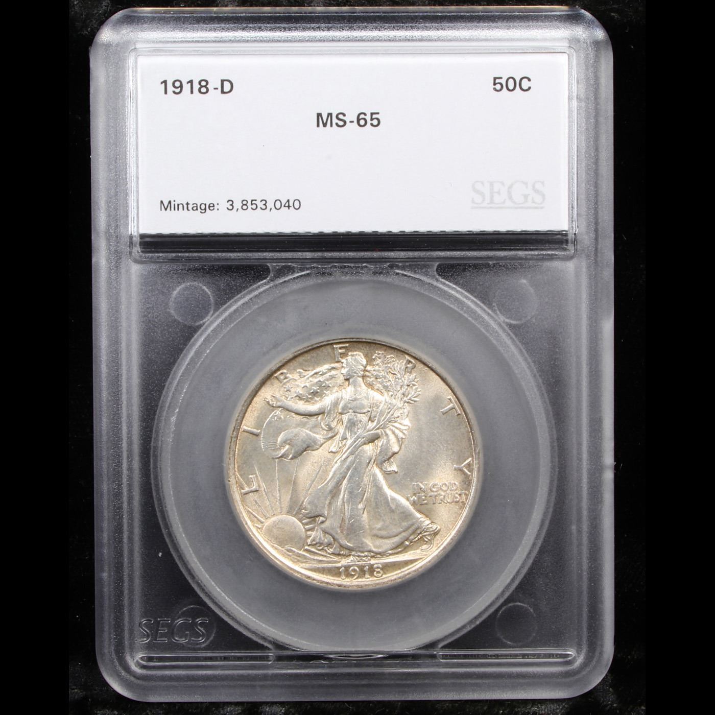 ***Auction Highlight*** 1918-d Walking Liberty Half Dollar 50c Graded ms65 By SEGS. This early issue from the Denver Mint is an important condition rarity among early Walkers. Nearly all of the 3.8 million half dollars produced entered circulation. Gem examples are seldom encountered. Strike quality was also a problem at the Denver Mint in this last year of World War I, as the facility apparently had a policy of lowering the strike pressure to extend die life. This example, although a bit soft on the skirt lines and the eagle's left leg, is still stronger than most others, and has well-struck details elsewhere. Bright mint luster radiates from the brilliant, mostly untoned surfaces. A few grade-limiting marks on Left leg are also noticeable only with a glass. Absolutely appealing, and virtually unobtainable finer. Tied for 7th Finest Known. I have included 2 ms65 examples for your comparison. A Corey's Pick, Bid to Win, Don't let it get Away, you might not find its equal Coin. I give this coin my highest recommendation