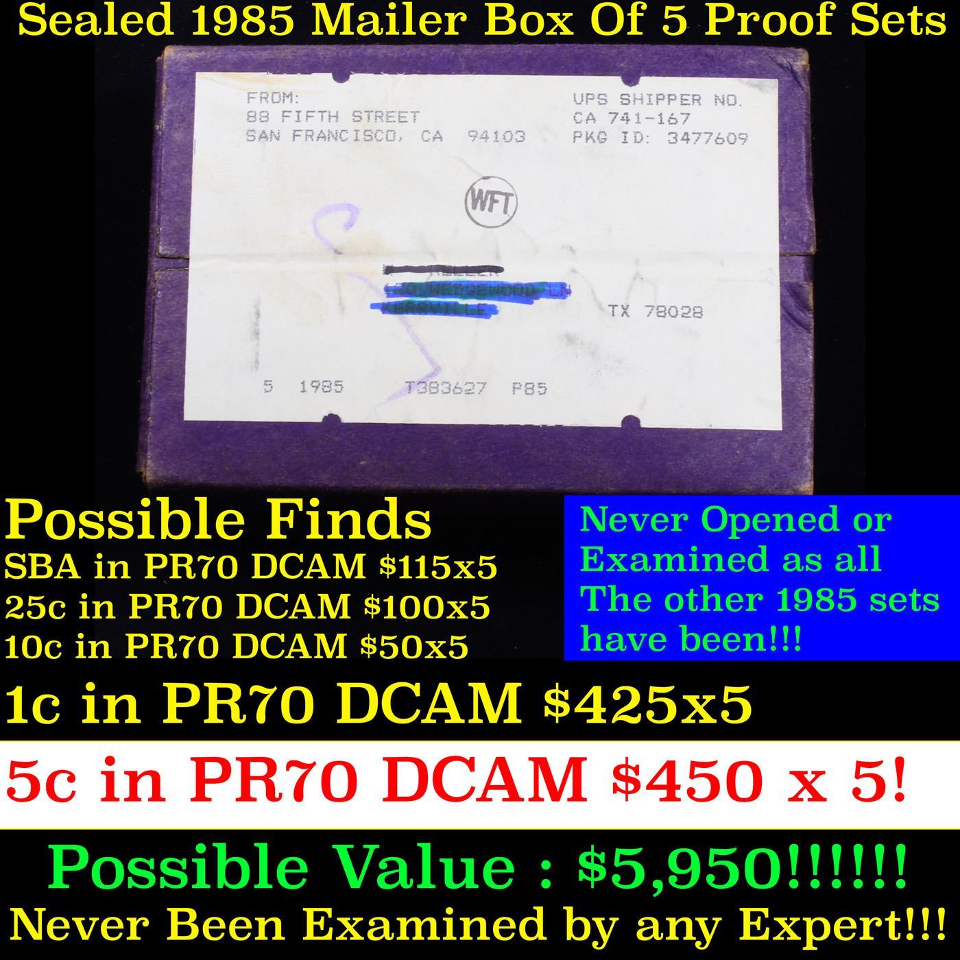 ***Auction Highlight*** Original sealed box 5- 1985 United States Mint Proof Sets. Up for Auction is an Unopened Mailer Box from 1985 containing 5 1985 Proof Sets!!!! Wow! - This Mailer Box is sealed exactly as it left the mint over 30 years ago. Each Proof set in this mailer box has never been reviewed or examined by anyone. Virtually every 1985 Proof Set has been looked at by Coin Experts who have identified potential PR70 DCAM Coins and had them slabbed. Those opened Proof Sets you find at coin shows or for sale individually have almost certainly been examined and reviewed. NOT ONE OF THE FIVE SETS IN THIS MAILER BOX HAVE BEEN SEEN BY HUMAN EYES IN 40 YEARS , So, What COULD be in these Sets, Well here are the 4 things that could be inside. An Kennedy 40c in PR70 DCAM Trending $115, a Washington 25c in PR70 DCAM Trending $100, a Roosevelt Dime in PR70 DCAM Trending $50, a Lincoln 1c in PR70 DCAM, TRENDING $425 BUT EVEN THAT IS JUST THE SIDESHOW! The REAL WINNER IN THIS LOTTERY BOX IS The 1985-s Jefferson 5c, a 1985-s Proof Jefferson 5c in PR70 DCAM TRENDS $475!!!! And there can be FIVE of Each in this BOX, This could be one of the very last boxes in EXISTENCE. This WONKA Box could Contain Coins Worth $5,950 - Good Luck in Obtaining This Unopened Mailer Box of 5 1985 Proof Sets!!!