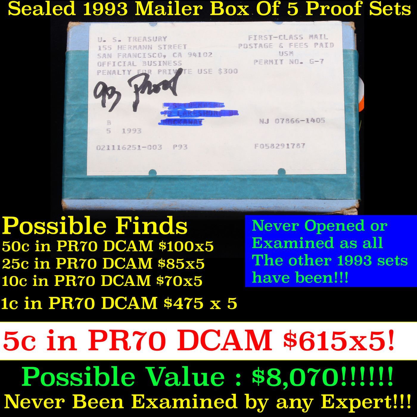***Auction Highlight*** Original sealed box 5- 1993 United States Mint Proof Sets. Up for Auction is an Unopened Mailer Box from 1993 containing 5 1993 Proof Sets!!!! Wow! - This Mailer Box is sealed exactly as it left the mint over 30 years ago. Each Proof set in this mailer box has never been reviewed or examined by anyone. Virtually every 1993 Proof Set has been looked at by Coin Experts who have identified potential PR70 DCAM Coins and had them slabbed. Those opened Proof Sets you find at coin shows or for sale individually have almost certainly been examined and reviewed. NOT ONE OF THE FIVE SETS IN THIS MAILER BOX HAVE BEEN SEEN BY HUMAN EYES IN 40 YEARS , So, What COULD be in these Sets, Well here are the 4 things that could be inside. An Kennedy 40c in PR70 DCAM Trending $48, a Washington 24c in PR70 DCAM Trending $44, a Roosevelt Dime in PR70 DCAM Trending $44, a Jefferson 4c in PR70 DCAM, TRENDING $40 BUT EVEN THAT IS JUST THE SIDESHOW! The REAL WINNER IN THIS LOTTERY BOX IS The 1993-s Lincoln 1c, a 1993-s Proof Lincoln 1c in PR70 DCAM TRENDS $100!!!! And there can be FIVE of Each in this BOX, This could be one of the very last boxes in EXISTENCE. This WONKA Box could Contain Coins Worth $1,440 - Good Luck in Obtaining This Unopened Mailer Box of 4 1993 Proof Sets!!!