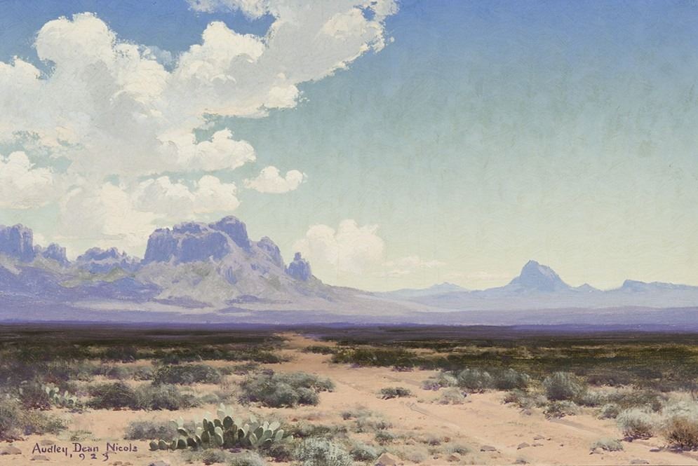Artist: Audley Dean Nicols; Title: Desert; Medium: Oil on canvas; Dimensions: 12 x 17 1/2 inches; Signed: Signed and dated 1923 lower left; Framed/Base: 20 x 26 inches