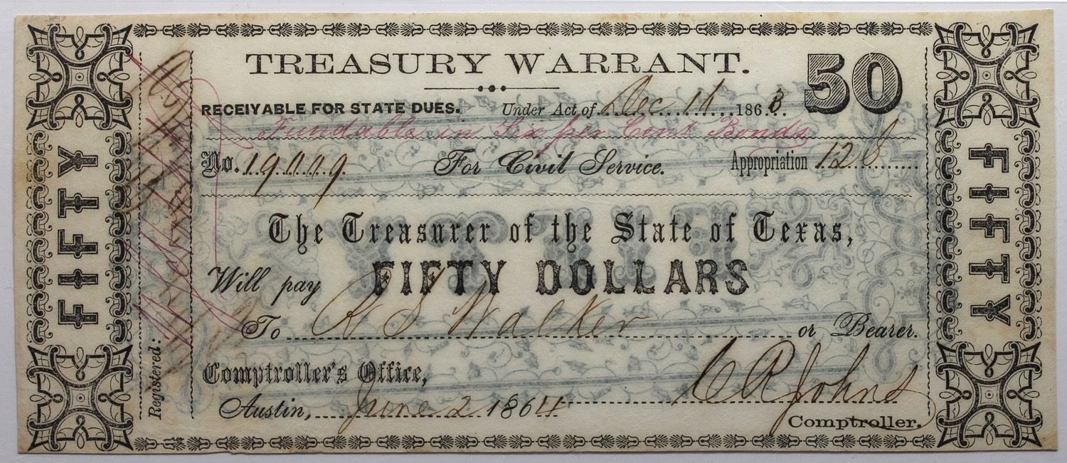 Austin, Texas 1860s $50 Treasury Warrant, Cr. 32A, PMG 53 EPQ.