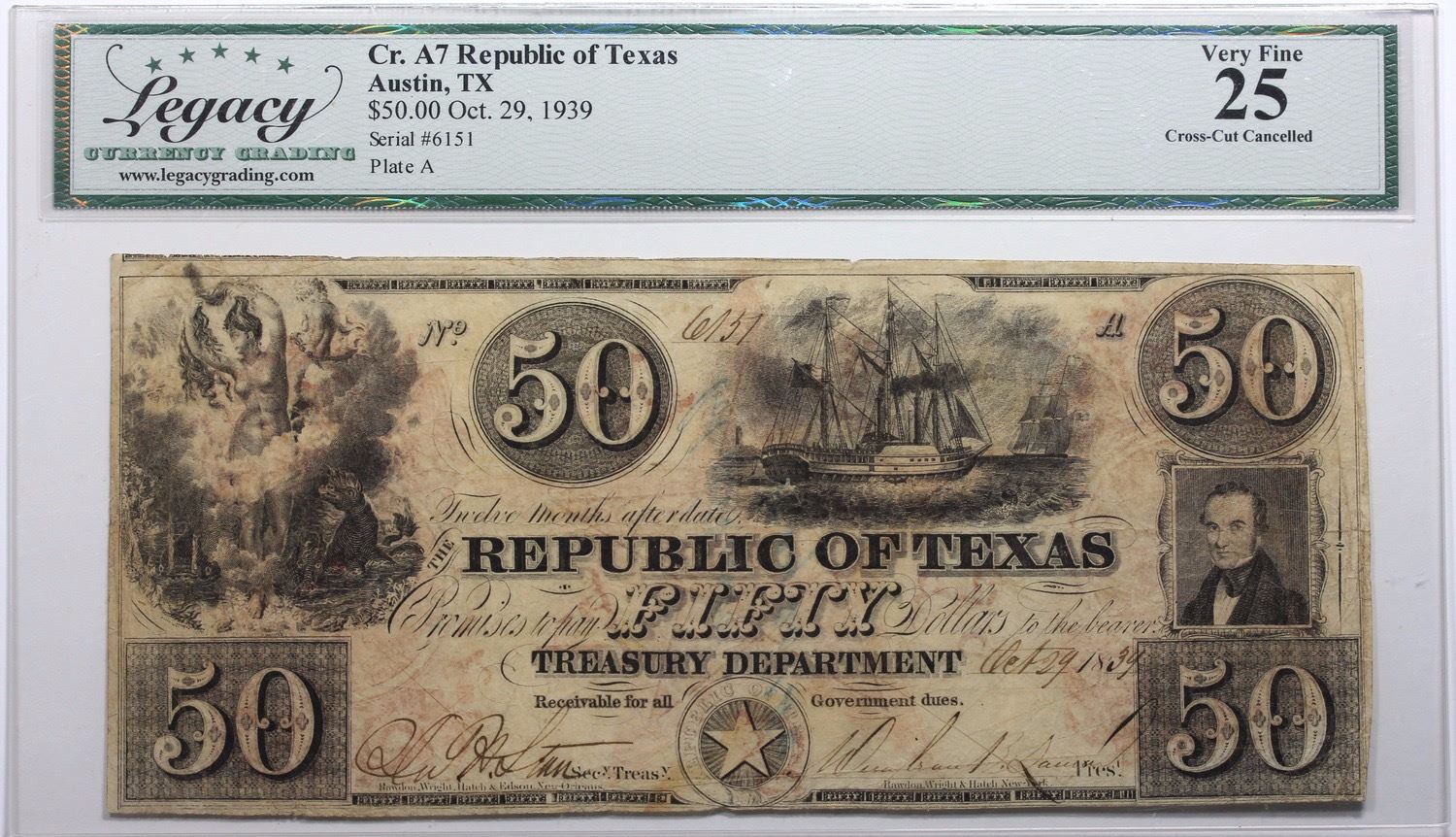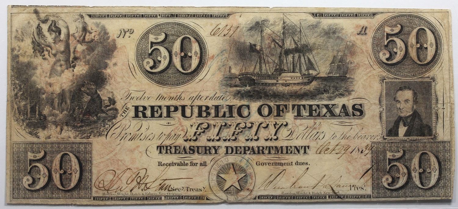 Austin, Texas: Republic of Texas, October 29, 1839 $50, Cr. A7, Legacy 25.
