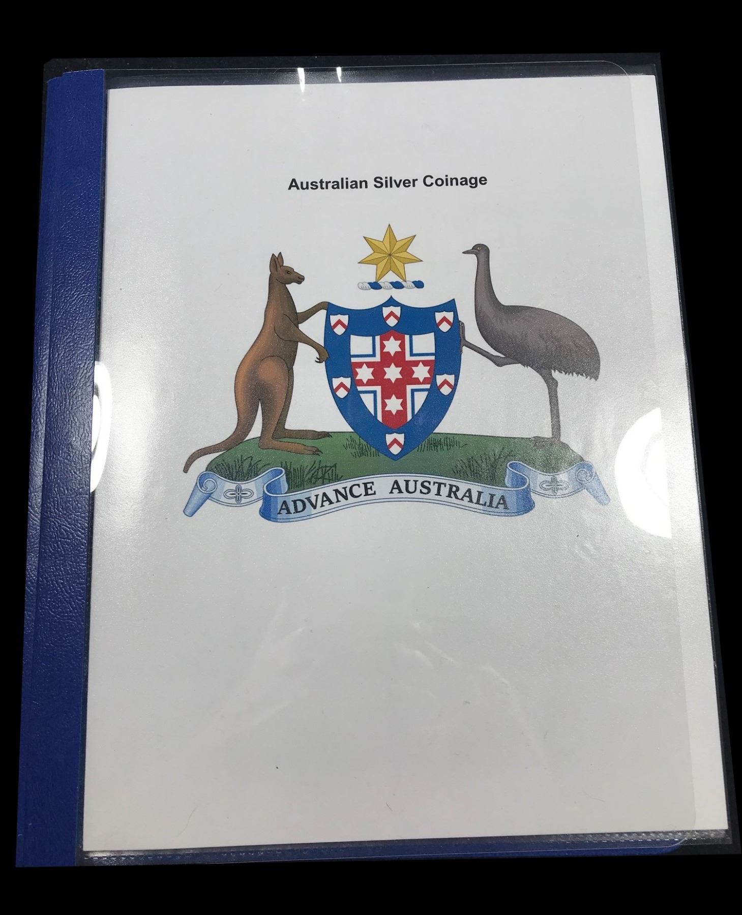 A nice representative collection of 34 Silver coins, consisting of Three Pence X 8 pieces (1910-44), Six Pence X 11 pieces (1924-1955), Shillings X 5 pieces (1911-1944), and Two Shillings X 10 pieces (1914 to 1963). All in varying circulated grades of preservation, housed in 2x2 pages in a blue folder with color Aussie coat-of-arms on front, and a detailed inventory of the contents. Net Silver content of 4.7781 oz, and a nice starter set