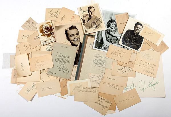Autograph Collection - Over 100 Celebrity Autographs. From the personal collection of early Chicago television personality and puppeteer, Bruce Newton. These are autographs Newton collected from movie stars and other famous people he came into contact with during his TV days (1950s-1970s). Many of the autographs are on 3 x 5 in. cards. and numerous items are inscribed to Mr. Newton. Several celebrities signed more than once. The collection should be viewed in person as all of the names cannot be listed here. Sold "as is".