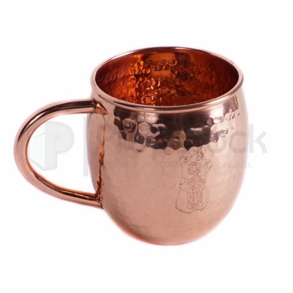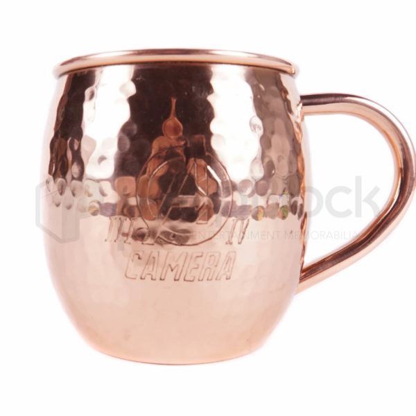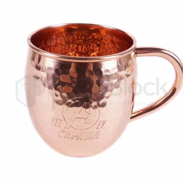 Crew mug given out to members of the camera department during the filming of the Marvel Studios blockbuster film Avengers: Endgame. After the devastating events of Avengers Infinity War (2018), the universe is in ruins. With the help of remaining allies, the Avengers assemble once more in order to undo Thanos’ actions and restore order to the universe. This hammered copper mug features the Avengers “A” logo on the front with the lettering “III IV Camera” and an engraved image of the Infinity Gauntlet on the back. This item is accompanied by it’s original packaging and remains in excellent, production made condition.