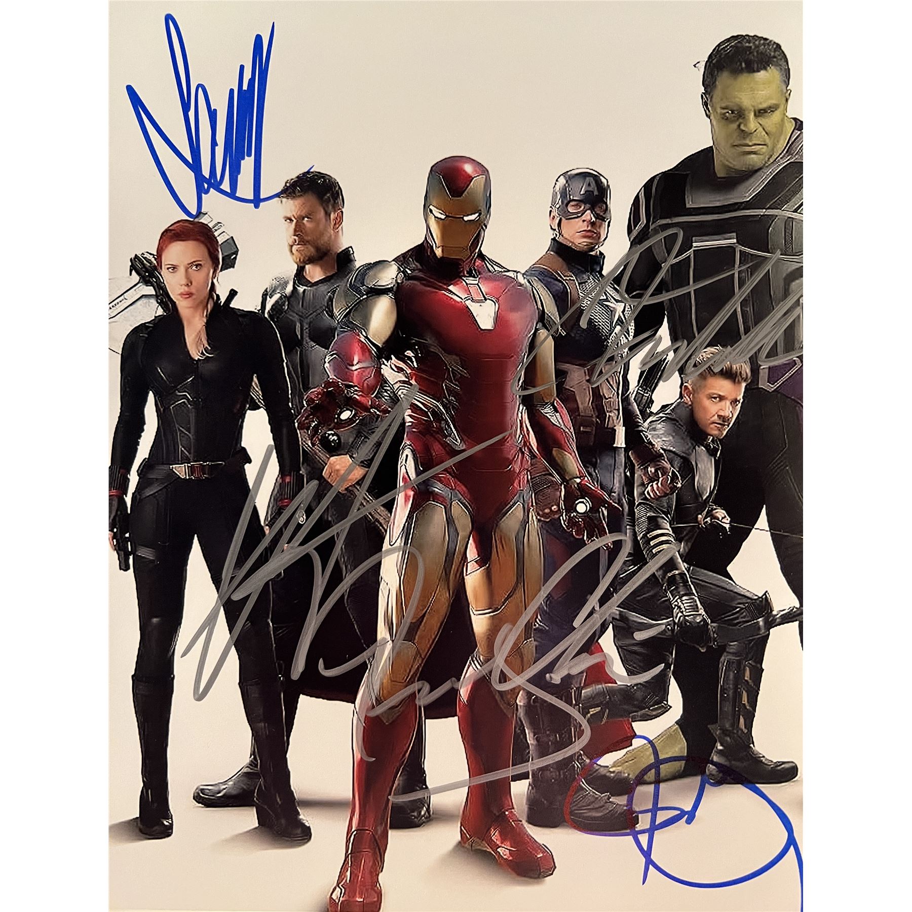 Avengers cast signed photo autographed by Robert Downey Jr., Chris Hemsworth, Chris Evans, Scarlett Johansson, Jeremy Renner and Mark Ruffalo. 8x10 inches