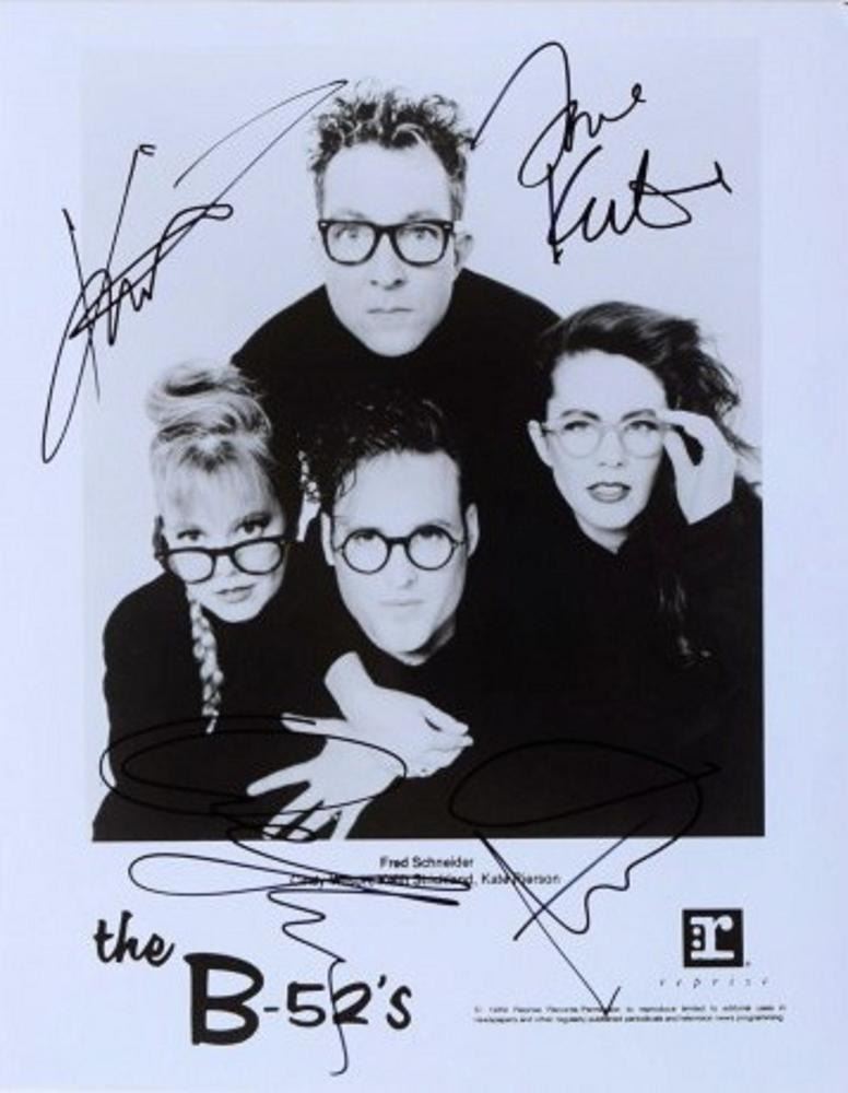B-52's photograph autographed by Kate Pierson, Cindy Wilson, Keith Strickland and Fred Schneider. 8x10 inches. This item is a reprint of an original autograph